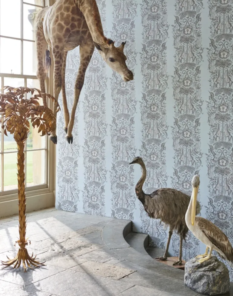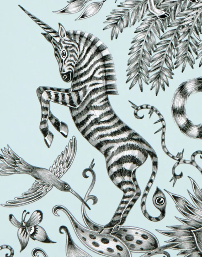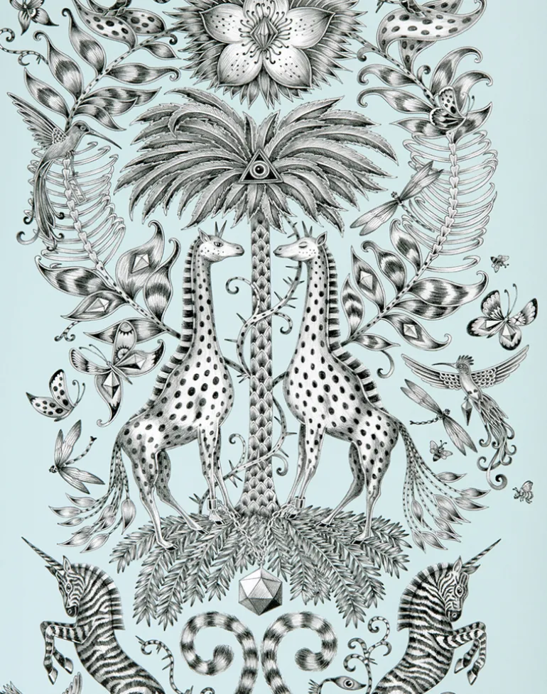 The Kruger Wallpaper is part of our magical Animalia collaboration with interior experts Clarke & Clarke. This striking design is inspired by a safari adventure, and features a fantastical array of creatures and foliage. Give your home a maximalist makeover with the unique Kruger print; this soft blue background acts as a fresh canvas for the intricate hand drawn safari scene upon it.