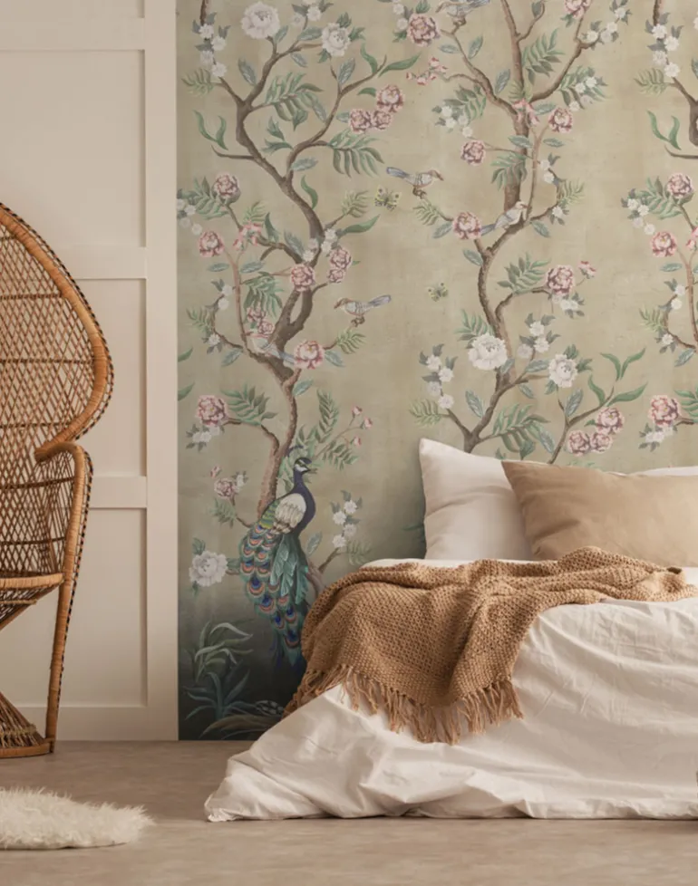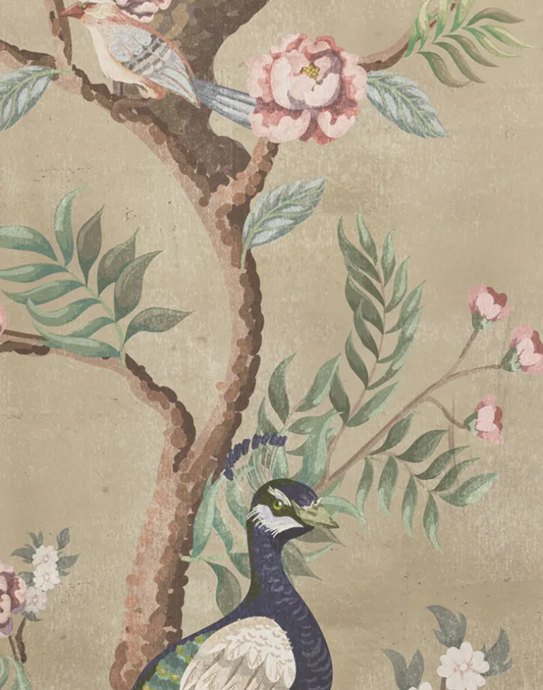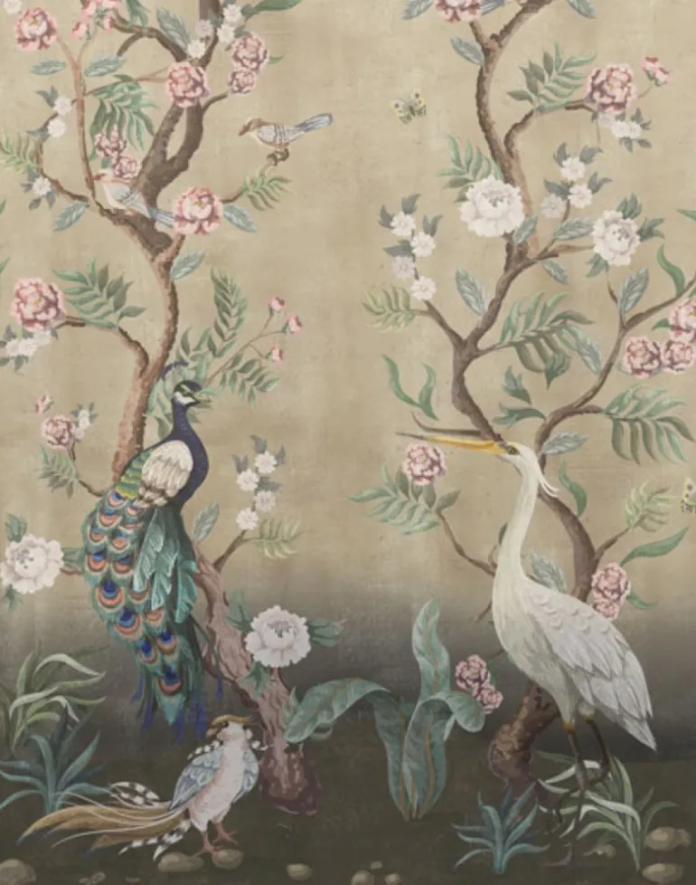A stunning new Chinoiserie wallpaper, featuring exotic animals and cherry blossoms climbing a subtly distressed wall.