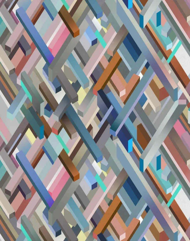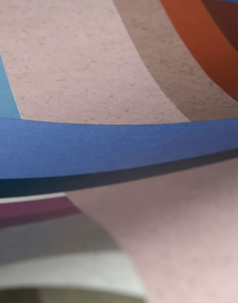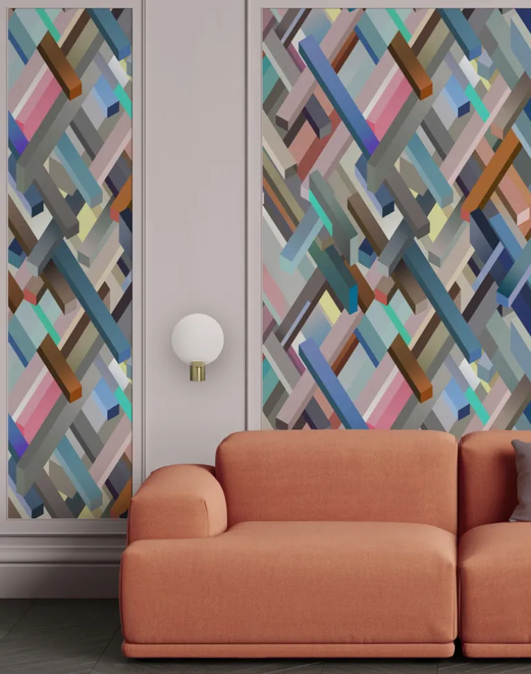 Kubrick expresses the hyperreality of the iconic director’s pioneering aesthetic. Extruded, gravity-defying geometric forms traverse the paper, criss-crossing with striking angularity. A play of exuberant and muted colours – some block, others ombre – heighten the sense of movement as these intersecting objects push through space. Inspired by the1968 classic, 2001 A Space Odyssey, the dynamic drama of this design imbues a space with a cinematic quality, suggestive of a rushing, ceaseless metropolis.