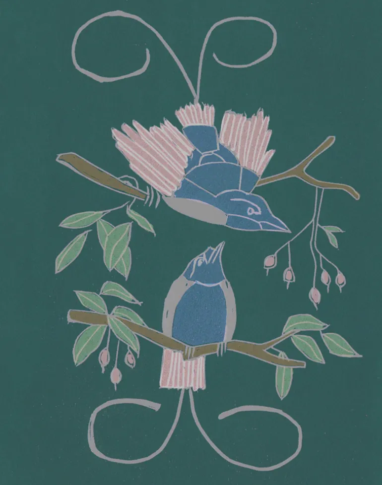 While in China she worked alongside masters in woodblock printing and developed her unique style. Traditional woodcuts are printed from separate blocks, one created for each color. she works differently, carving away each color, one at a time, and uses the same block to print all the layers of her designs. It takes at least a month to complete a full series of carvings and color layers. This process of wood carving and painting in layers produces uniquely rich, layered, painterly prints. All designs are printed by hand in her studio in London using non-toxic techniques. Ink is rolled onto the wood and printed over the previous layer. Some designs only need one color, others require several.