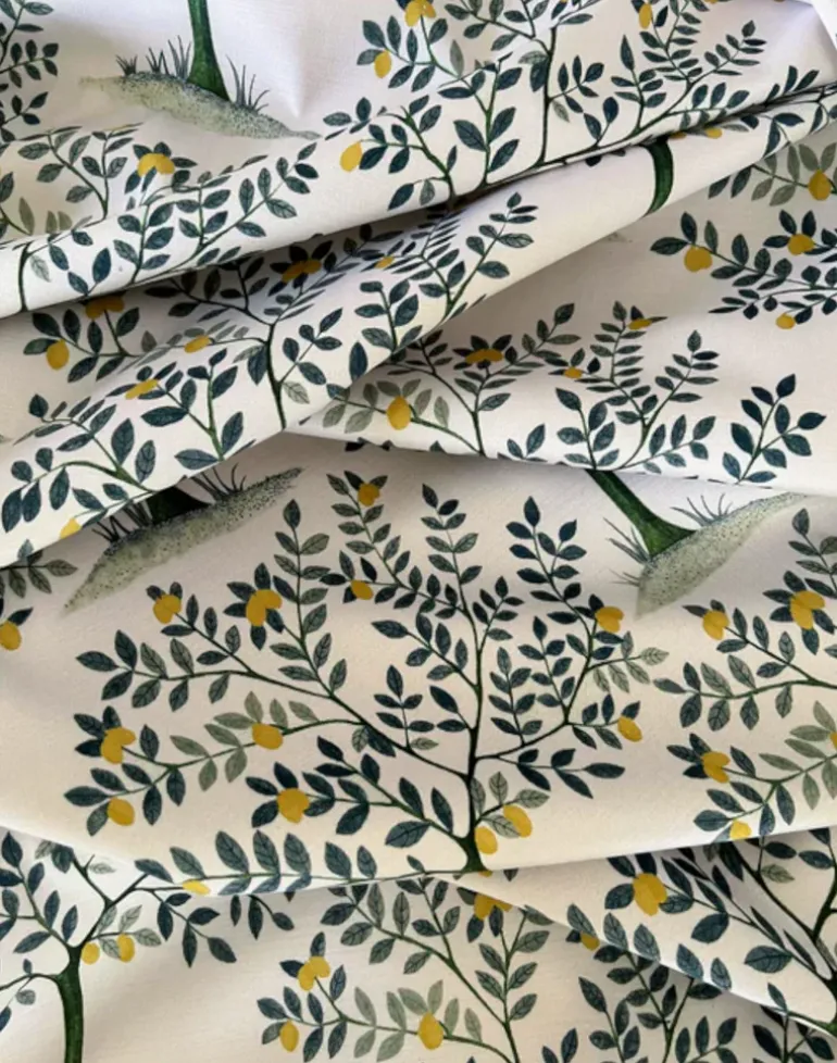 Lemon grove fabric is an illustrative design depicting Lemon tress, hand painted by Shweta’s signature style inspired by Indian miniature painting techniques using pigments and meticulous brush work. Lemon Grove fabric brings freshness in a space with an eclectic zest.