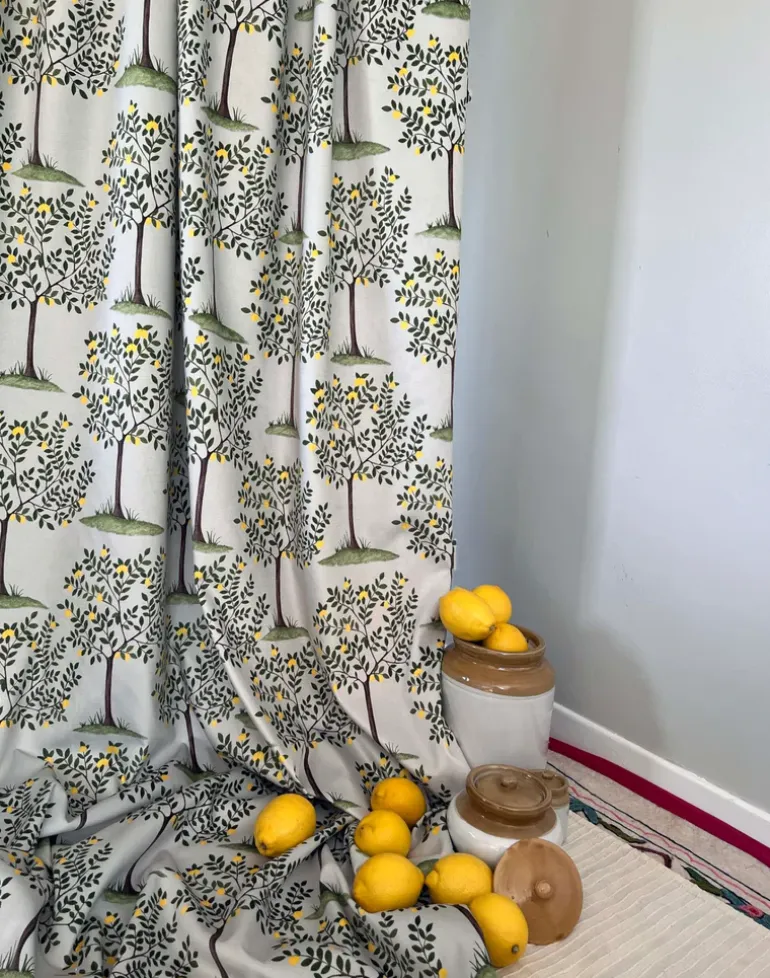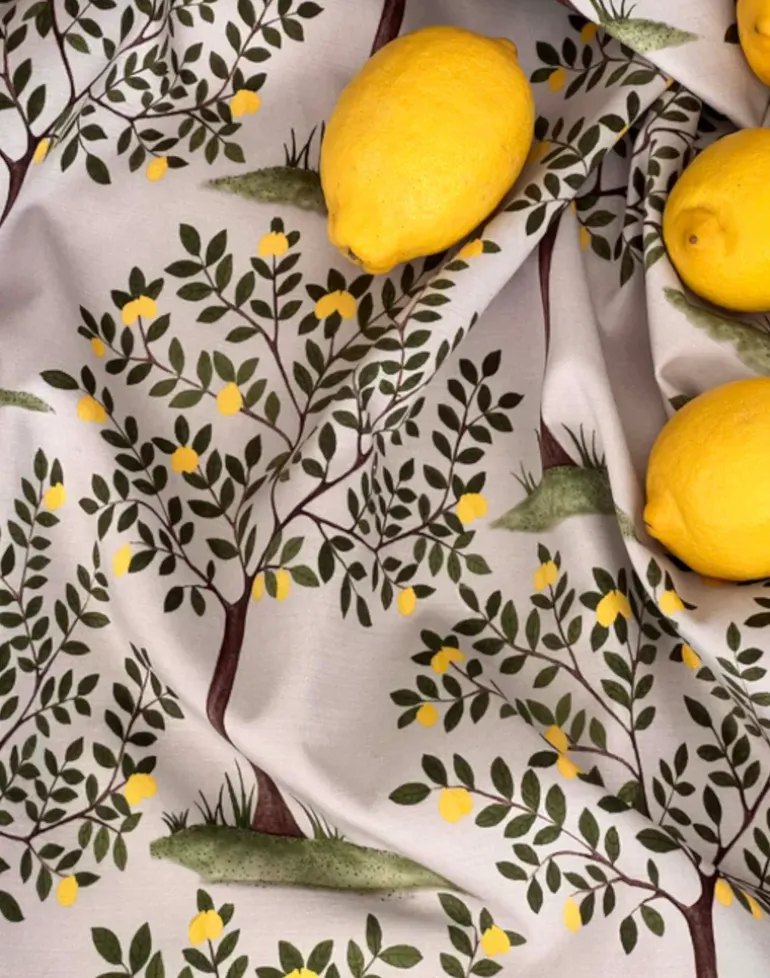 Lemon grove fabric is an illustrative design depicting Lemon tress, hand painted by Shweta’s signature style inspired by Indian miniature painting techniques using pigments and meticulous brush work. Lemon Grove fabric brings freshness in a space with an eclectic zest.