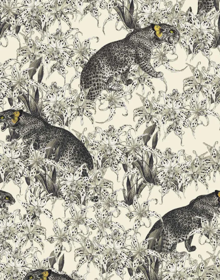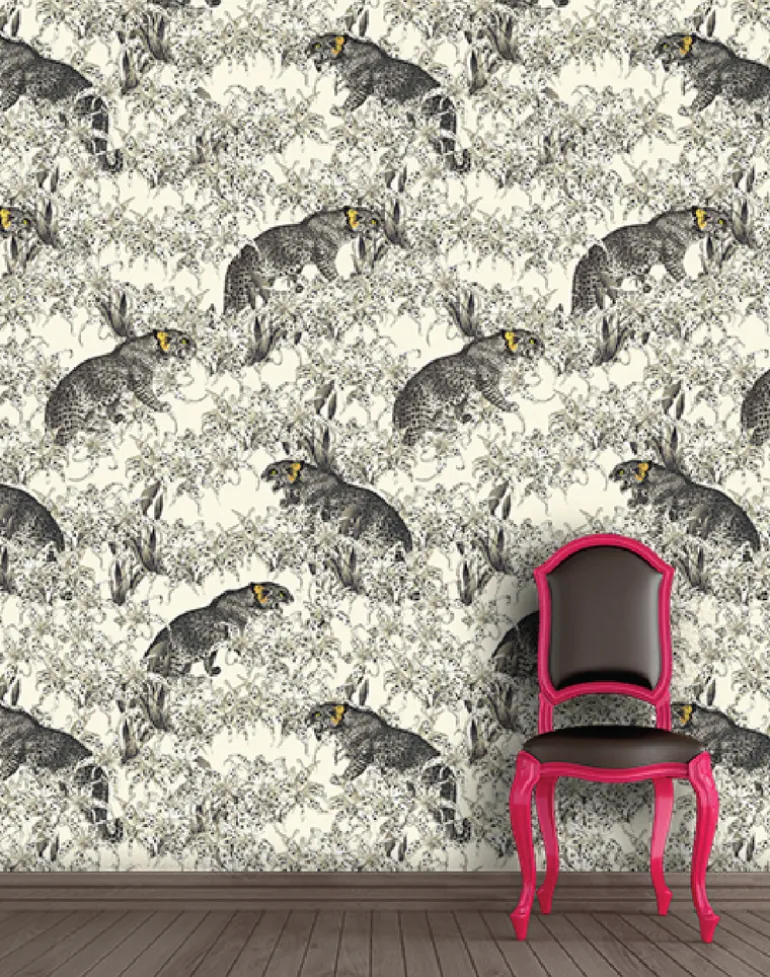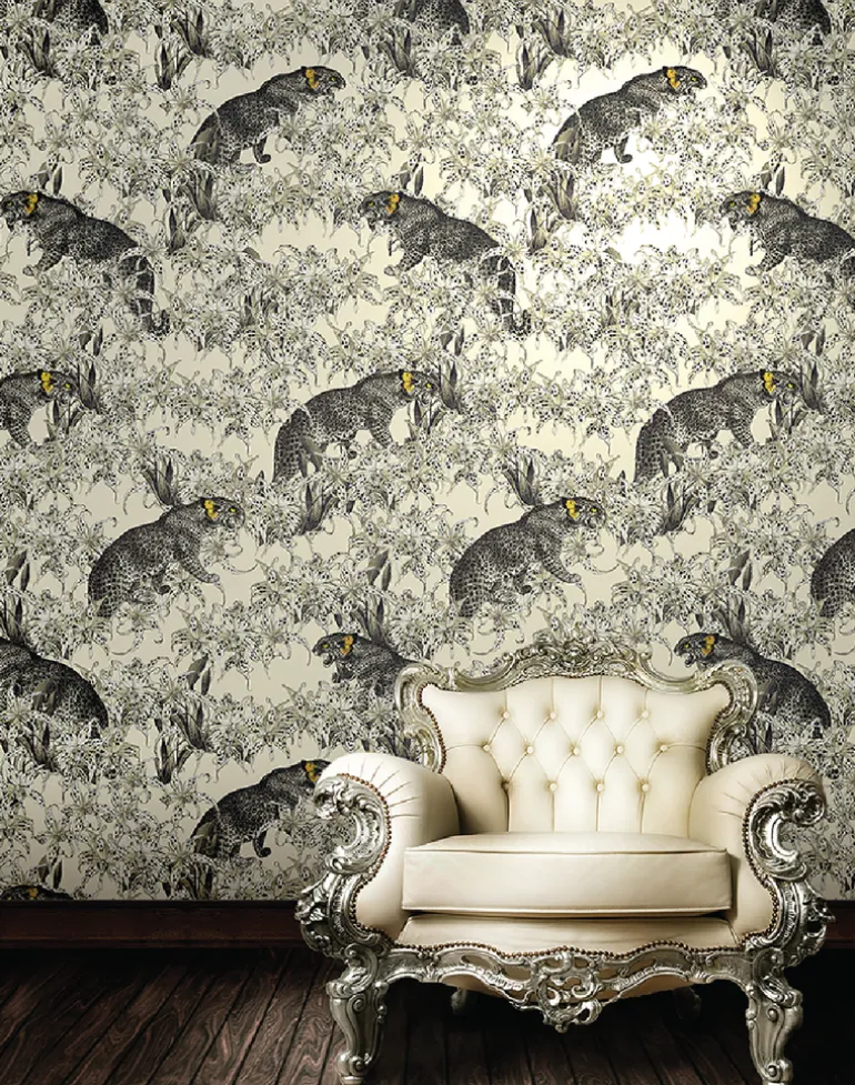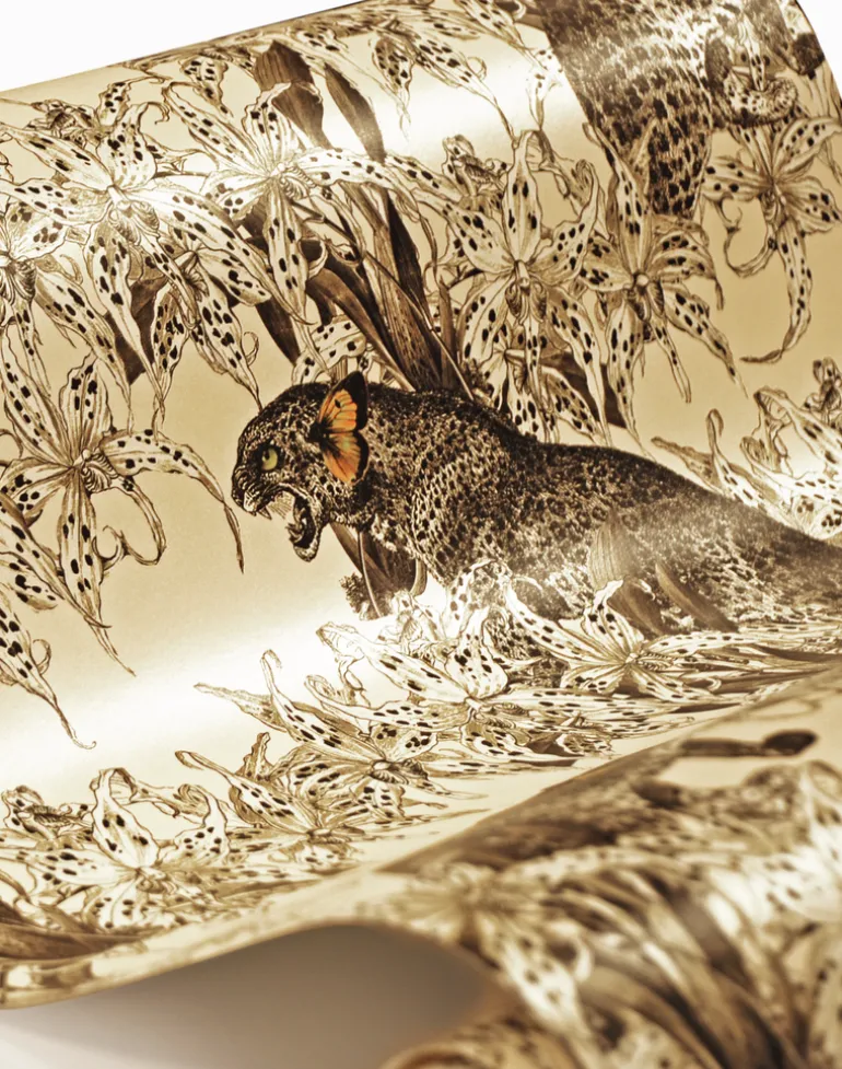 Witness wild leopards as they slink through an ivory jungle, camouflaged by vanilla blond leaves amongst a softly shimmering background – a luxurious choice full of feline attitude. Printed on unique pearl iridescent paper, the beautiful burnished finish will gleam with a pearly glow as it catches the light.