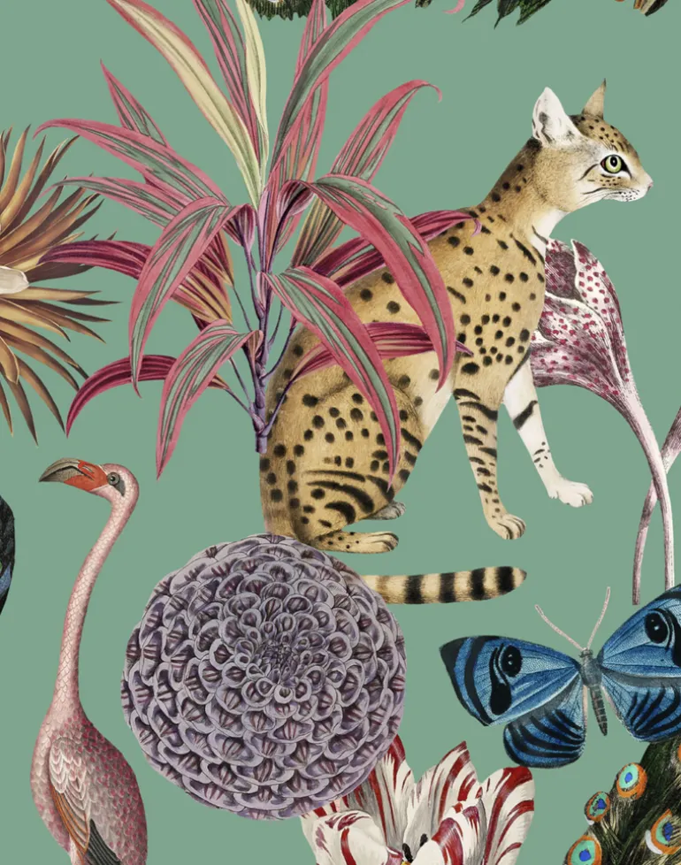 Akin to a magnificent work of art, enchanting Les Plumes depicts a gloriously tropical utopia. A large-scale, maximalist print, its menagerie of peacocks, flamingos, butterflies, and sphinx meander amongst a riot of big, bold blooms. Prepare to be entranced.