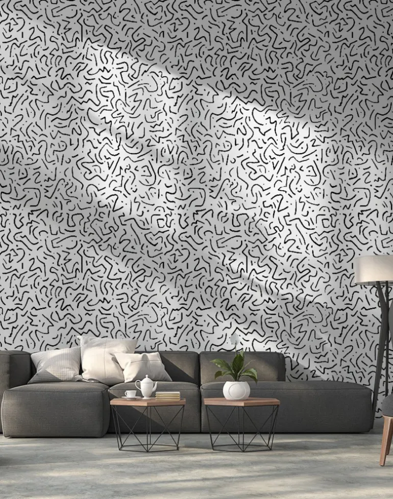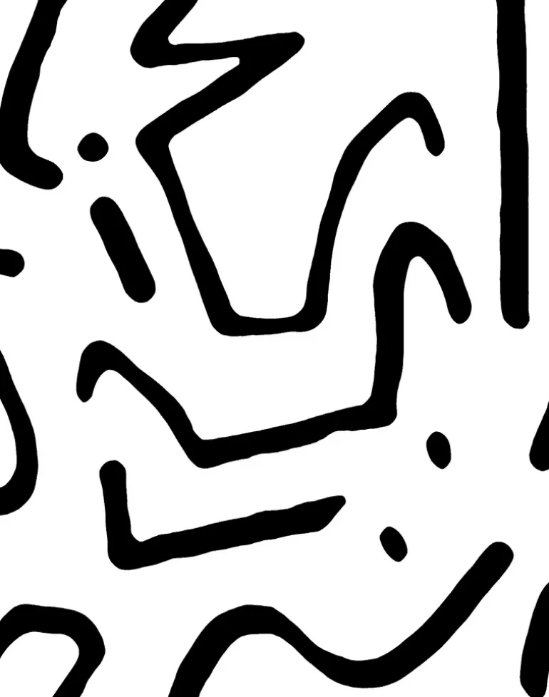 Merenda created this pattern from a drawing by her partner, Max Kahan. The energetic pen strokes hint at Keith Haring’s art from the ‘80s and make the eye dance throughout the pattern’s negative space. Each of the 10 colorways are named after dance moves from the ‘80s.
