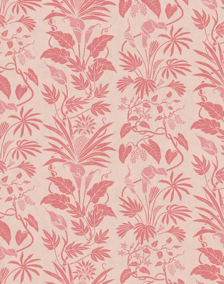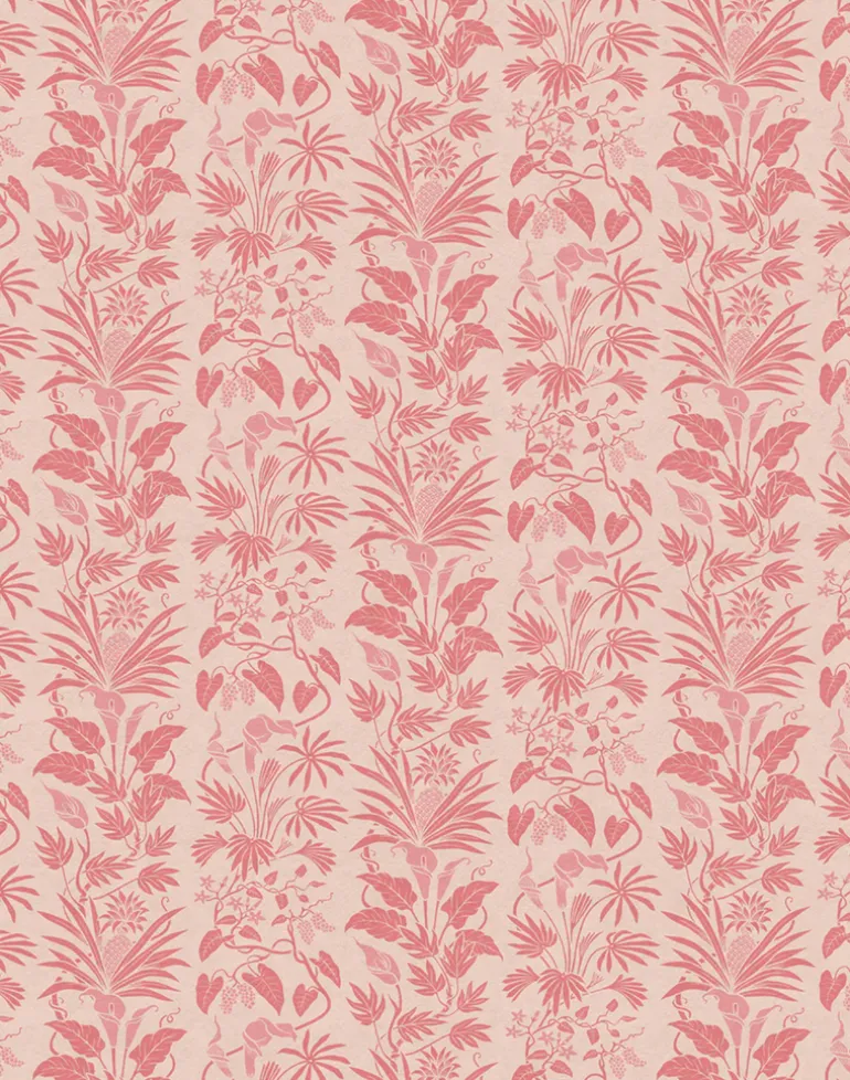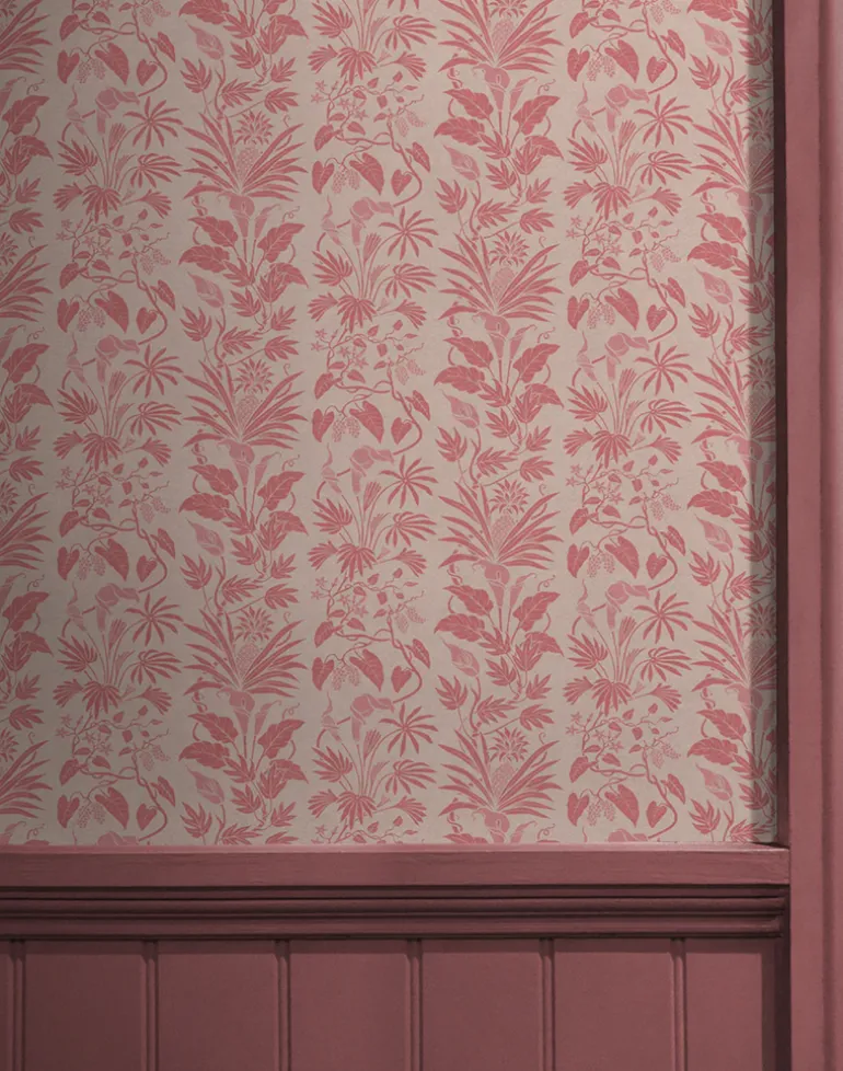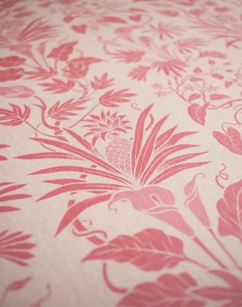 A beautiful botanic wallpaper with trailing foliage that brings nature into the heart of your home. We love using this pattern as a bedroom or bathroom wallpaper that brings the outside in. Discover Strawberry Blush, a delicate palette of soft pinks with a chalky plaster base.