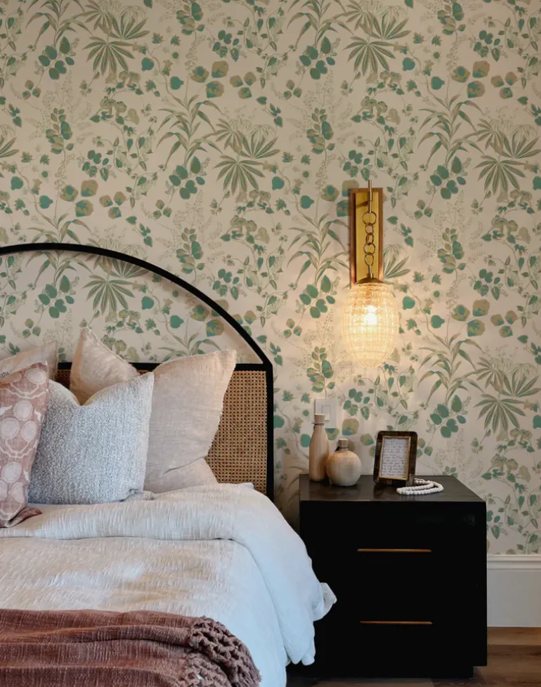 Eden is a joyful flourish of wild plants. The illustrated motifs are made up of exotic Palms, climbing Jasmine and Andira tree flowers, which surround the focal point of ripe orange forbidden fruit. This detailed botanical garden creates an immersive experience in any space. Little Eden is available in three colors, Night, Meadow, and Tansy.