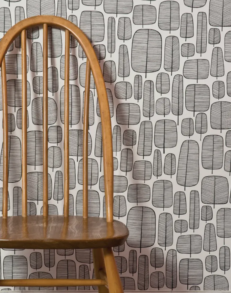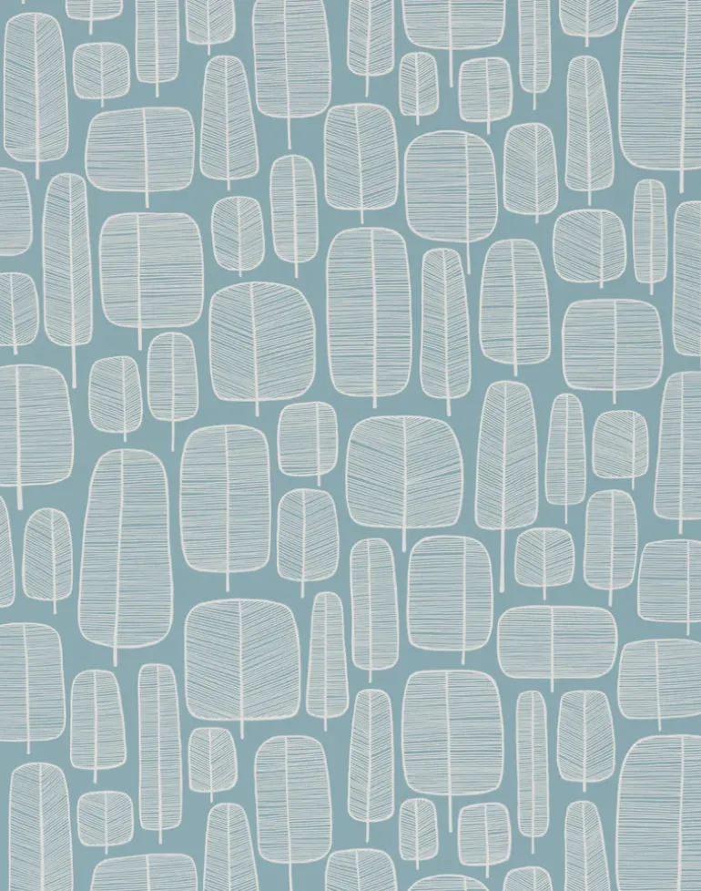Intricate whimsical illustrations of small line drawn trees evolved from simple pen studies in a sketchbook. Each tree within the wallpaper width is unique, creating an even natural texture on your walls.