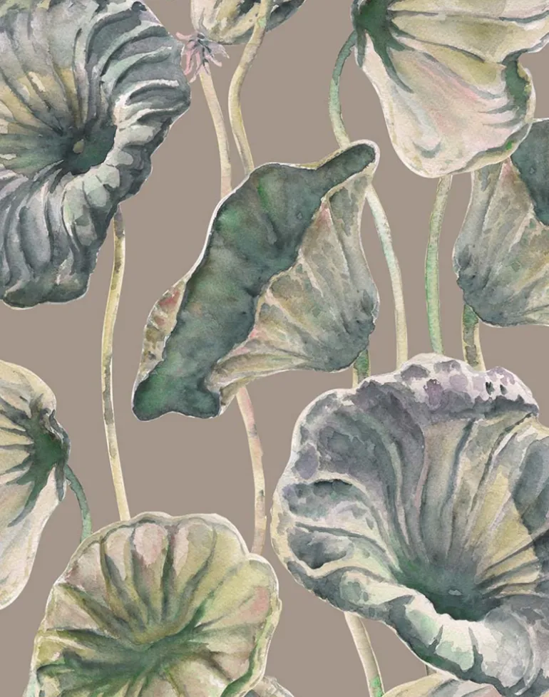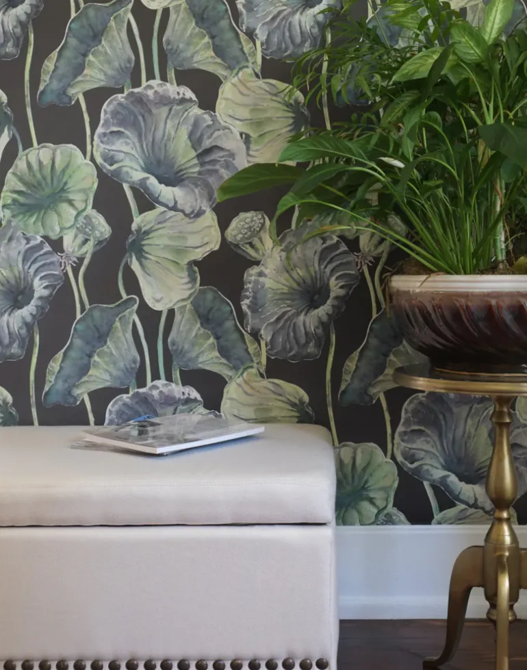 Lotus leaves rendered in watercolor hues of green and purple curl and wind against a near black ground in this oversized wallpaper pattern.