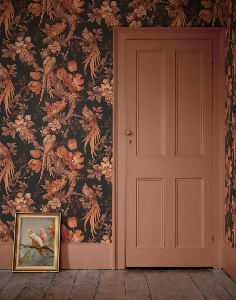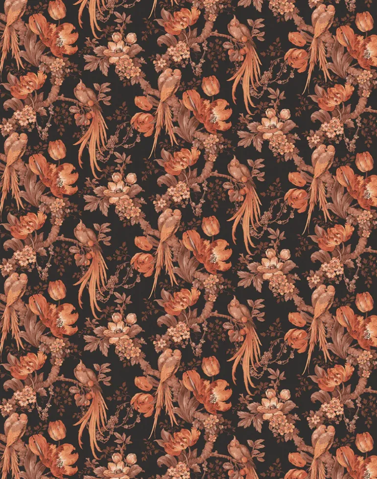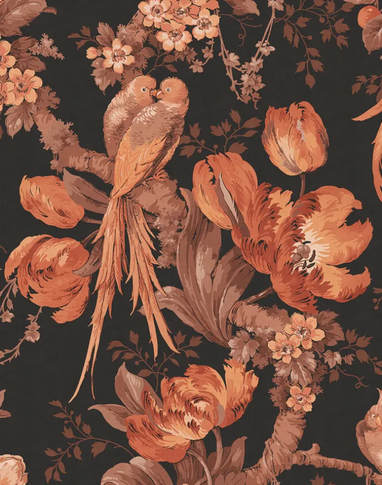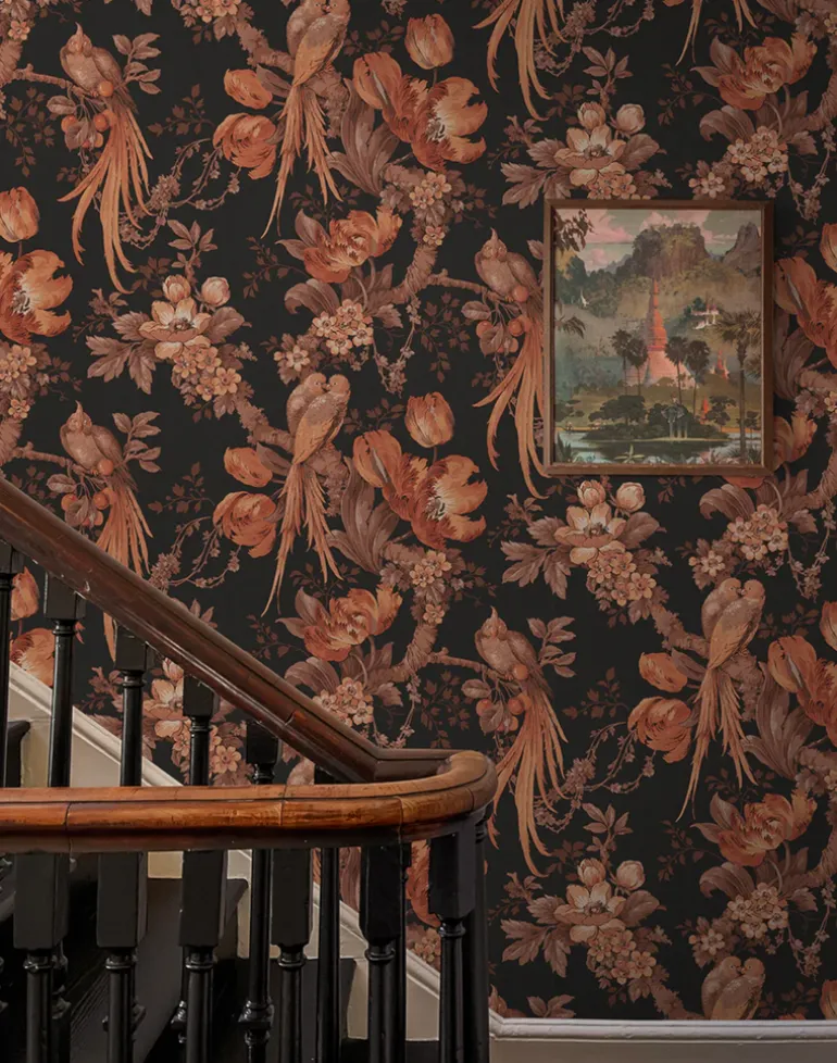A stunning wallpaper with a dramatic black background and accents of burnt oranges and browns. We love using this as a bold hallway or living room wallpaper.