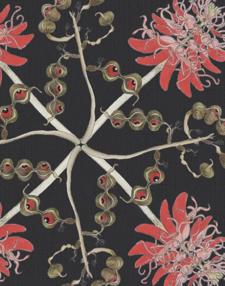 Lucky Bean – Erythrina lysistemon is an African wonder tree that fertilises the soil, helps farmers time their planting with the appearance of the stunning red blossoms in Spring, makes live barbed fencing, provides black and red seeds for jewelry… As well as these uses, every part of the plant provides sustenance: the flowers give nectar to birds and bees, the leaves are eaten by creatures from rhinos to kudu, the flower buds are relished by vervet monkeys, and the bark is consumed by elephants and baboons. Even the roots are eaten by bush pigs. What a lucky bean.