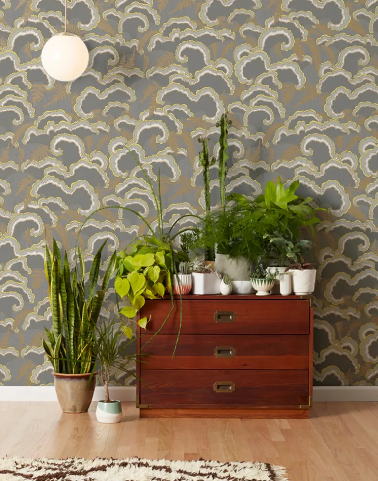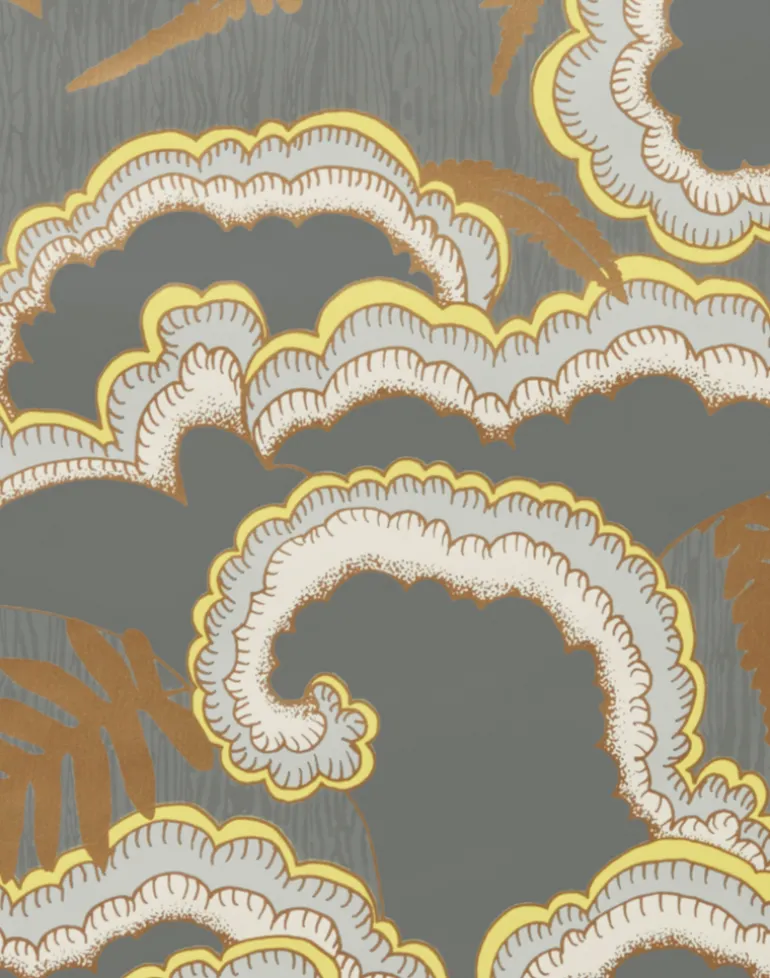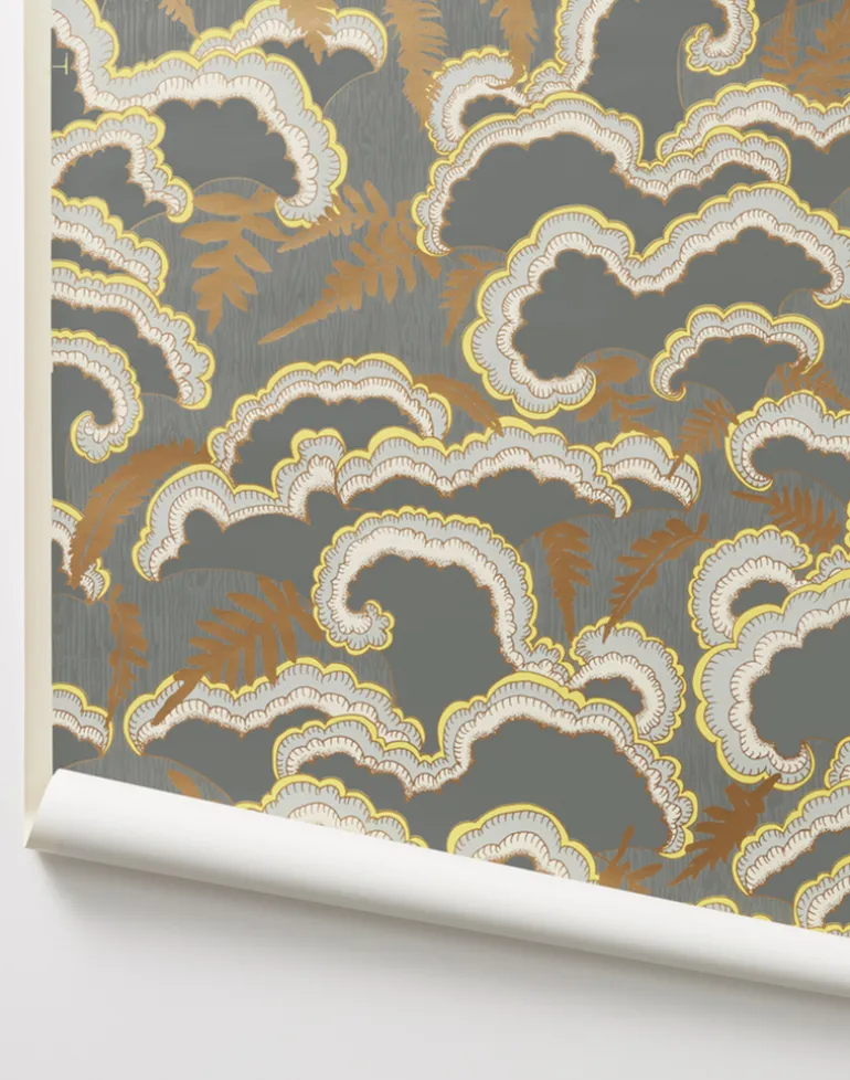 This five-color (including metallic gold) wallpaper is hand-screenprinted using water-based inks on recyclable paper.