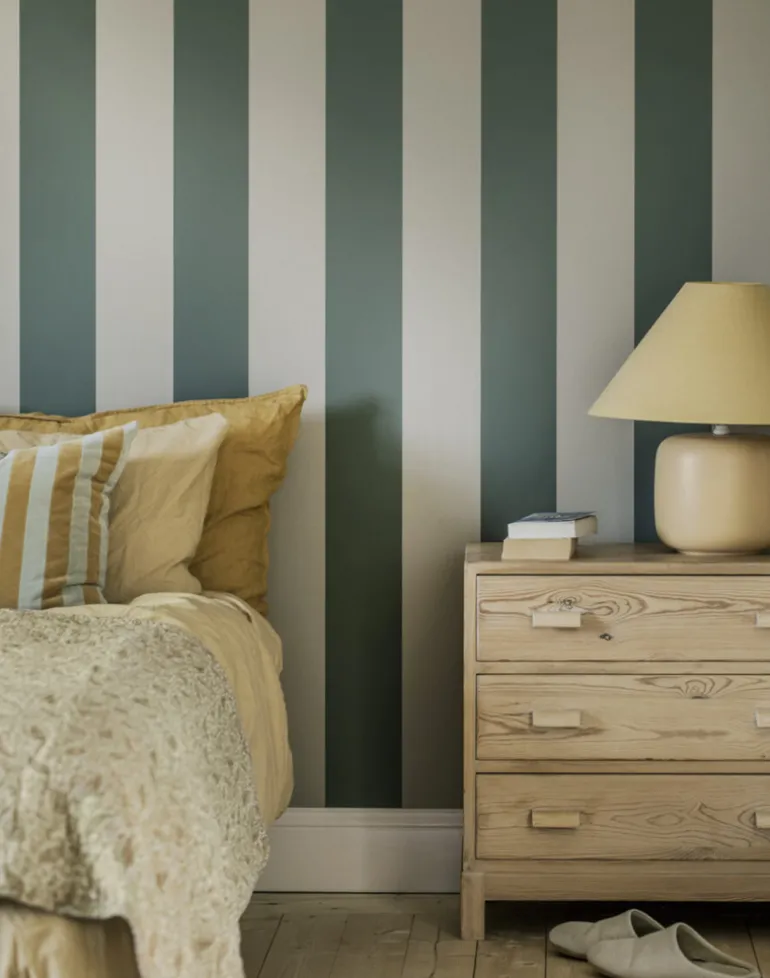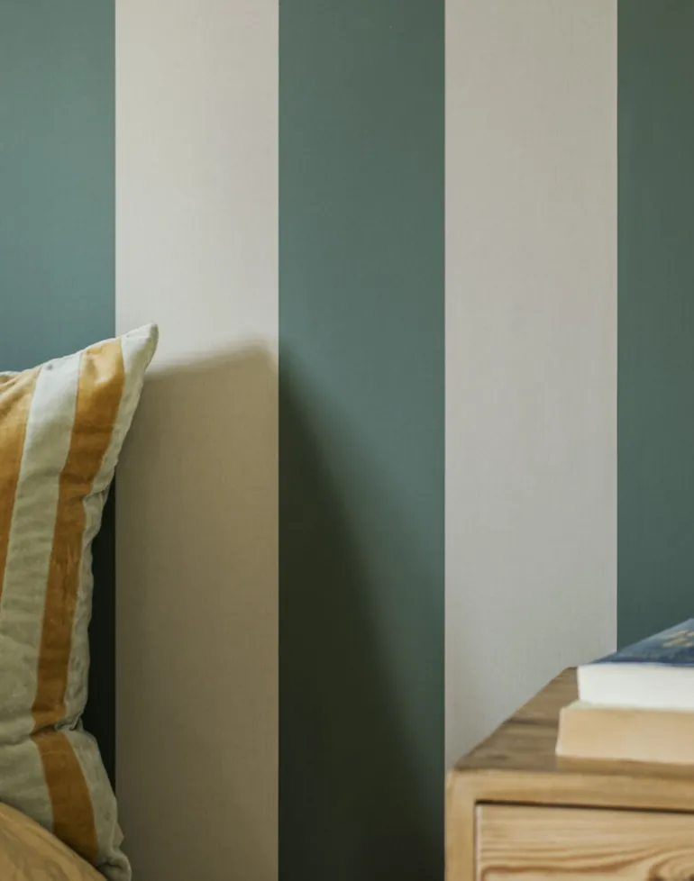 Old in the paper clip but always relevant – the stripe. Here in a fading green shade against a darker background color. Like the sandy beach when the waves wash in. Match it with more greenery in Lush hills tactile or let it hook arm with the lovely Duck Pond.