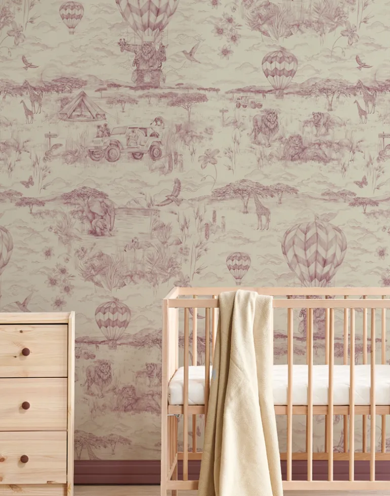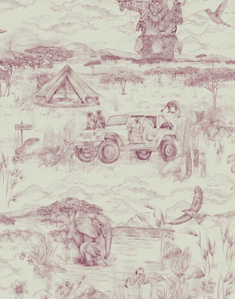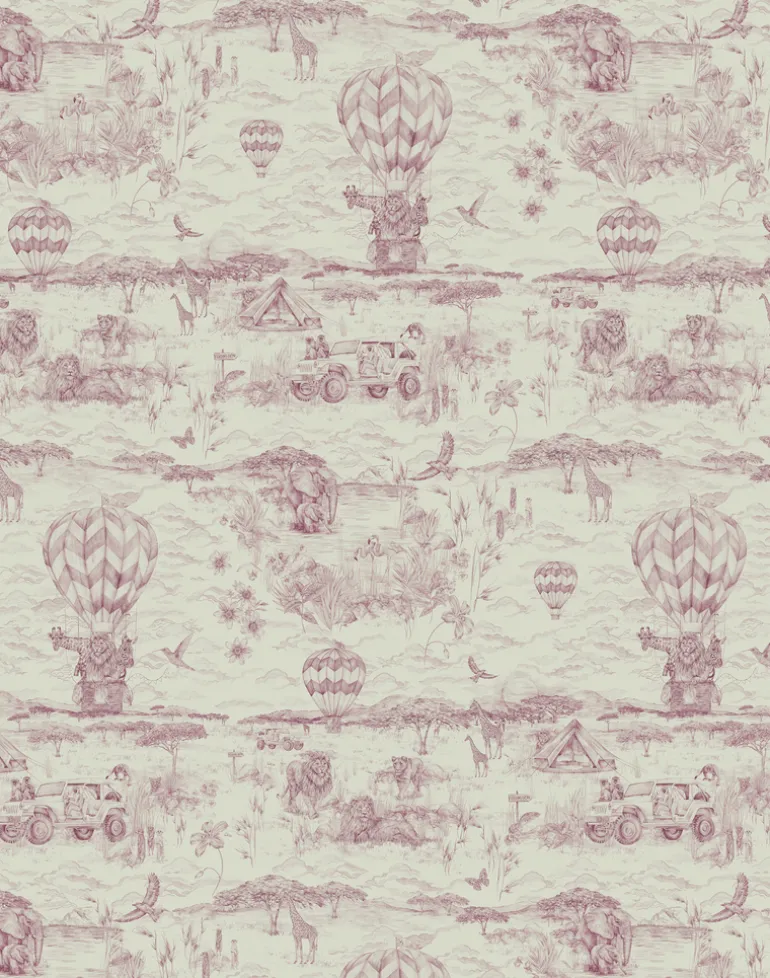 A friend looking for a wallpaper for her own nursery inspired this design. I began drawing during her pregnancy and many months of work later, the design is complete just in time for baby Maggie’s arrival. Her surname is Lyons, therefore Lions had to be the theme of the wallpaper. I am fascinated with Tanzania and the immense ecosystems of the Serengeti and Kitula national parks. We decided on this being the setting for the design. Loving the idea of incorporating hot air balloons into the wallpaper, an animal led safari started to shape the story. I love the traditional French toile style of wallpaper, so delicate, chic and intricate; it seemed the perfect way to layout and colorize it. The design escalated from there, with endless additions and tweaks, but the devil really is in the detail for this one. Spot all the little hidden creatures and read the tale interwoven into the wallpaper…