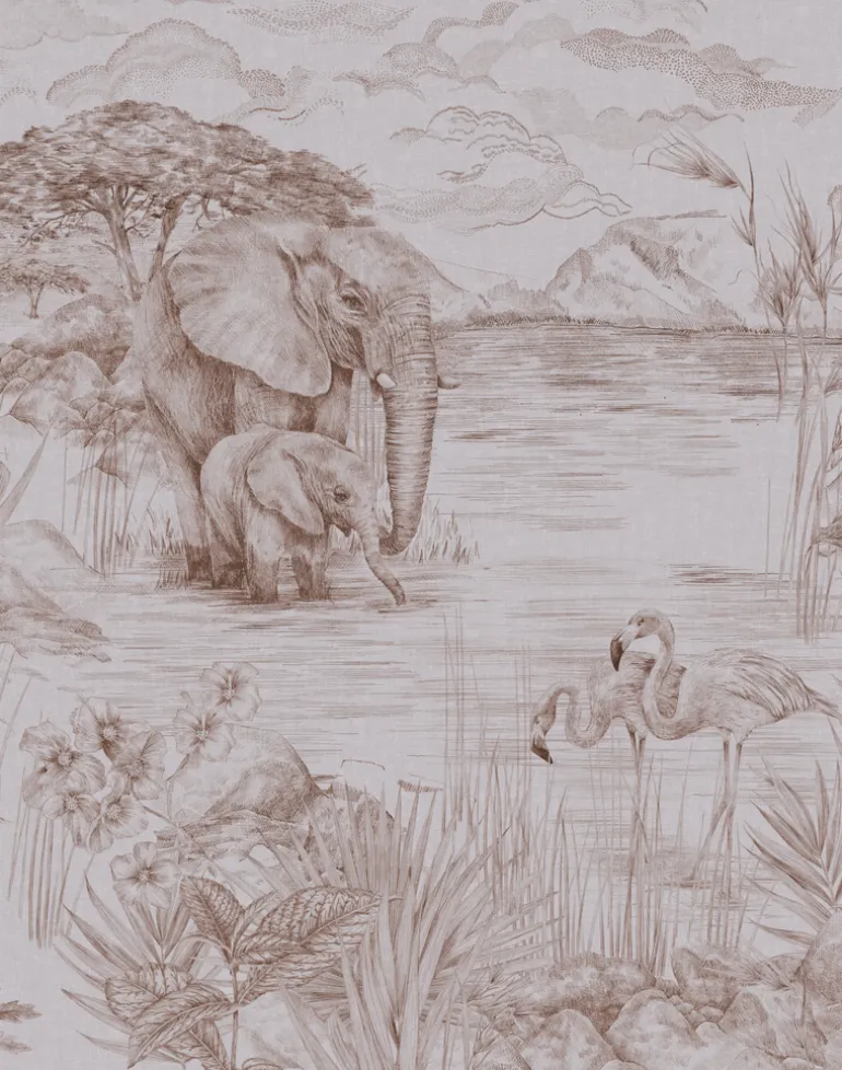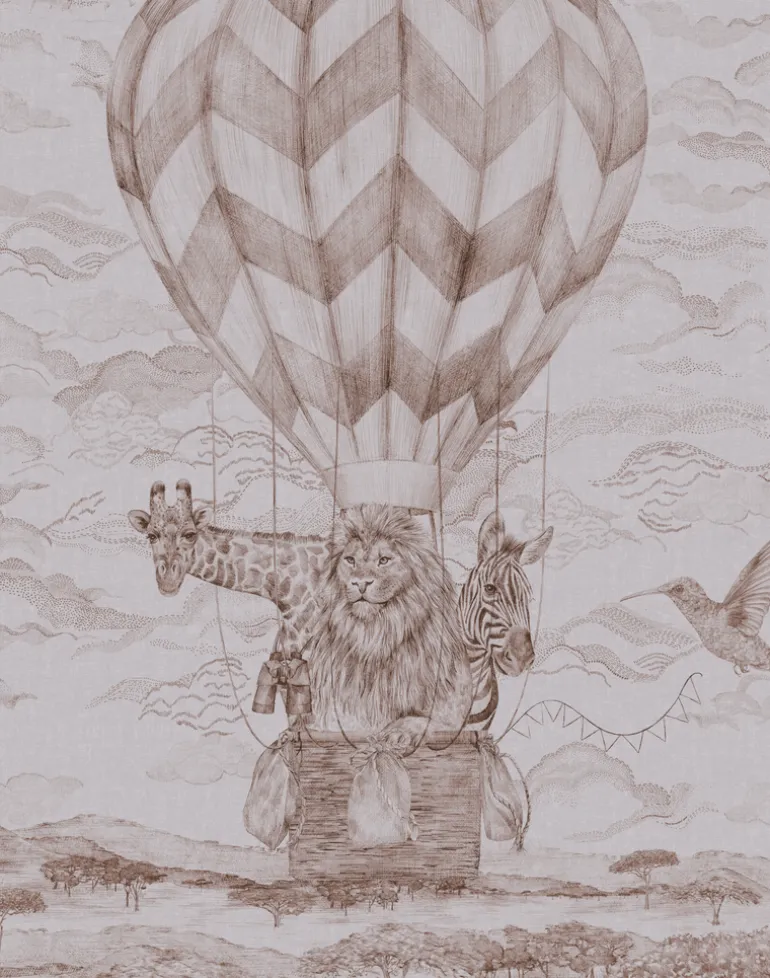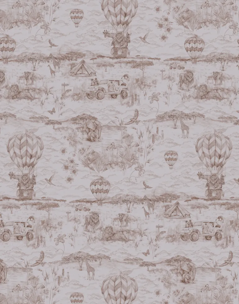 A friend looking for a wallpaper for her own nursery inspired this design. I began drawing during her pregnancy and many months of work later, the design is complete just in time for baby Maggie’s arrival. Her surname is Lyons, therefore Lions had to be the theme of the wallpaper. I am fascinated with Tanzania and the immense ecosystems of the Serengeti and Kitula national parks. We decided on this being the setting for the design. Loving the idea of incorporating hot air balloons into the wallpaper, an animal led safari started to shape the story. I love the traditional French toile style of wallpaper, so delicate, chic and intricate; it seemed the perfect way to layout and colorize it. The design escalated from there, with endless additions and tweaks, but the devil really is in the detail for this one. Spot all the little hidden creatures and read the tale interwoven into the wallpaper…