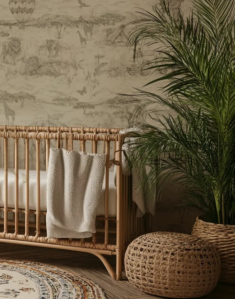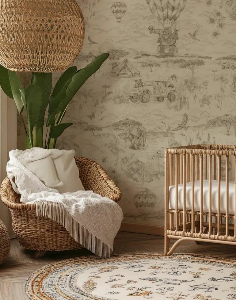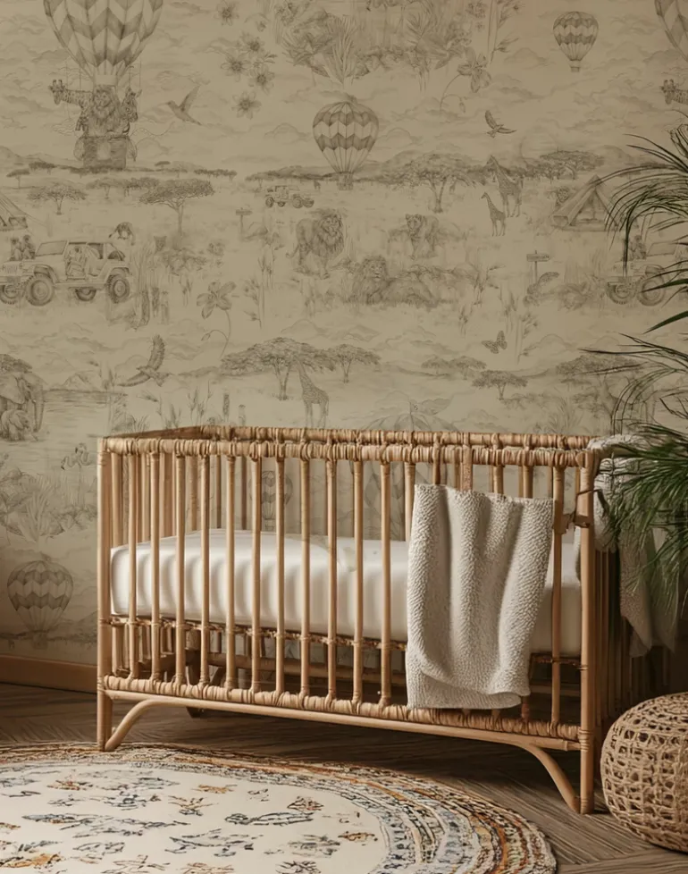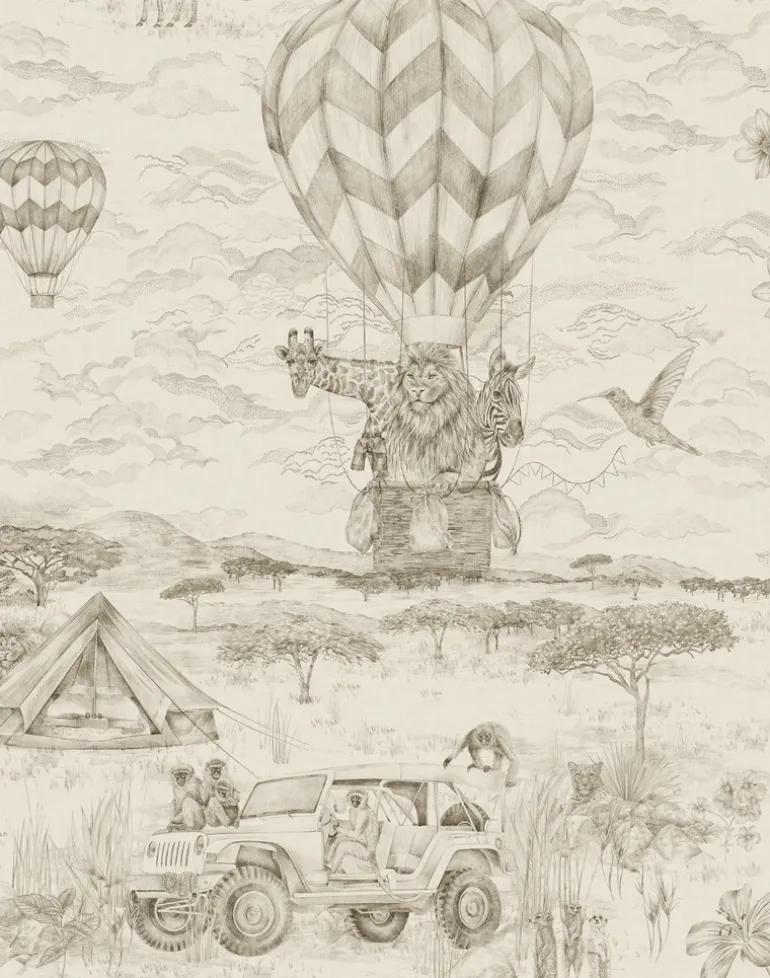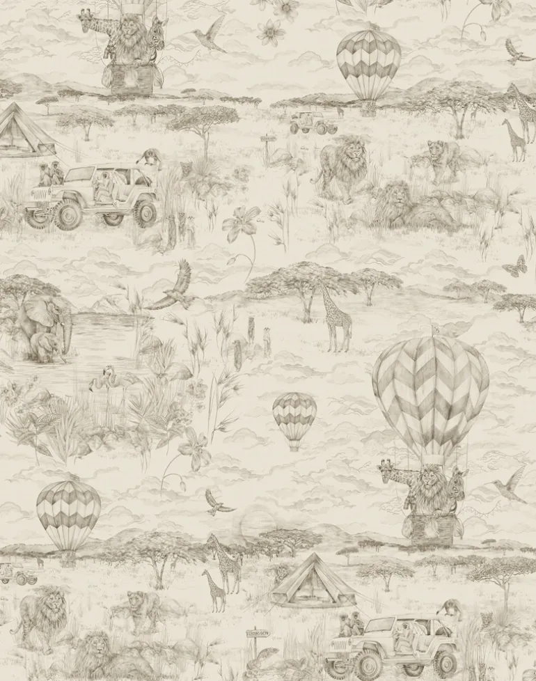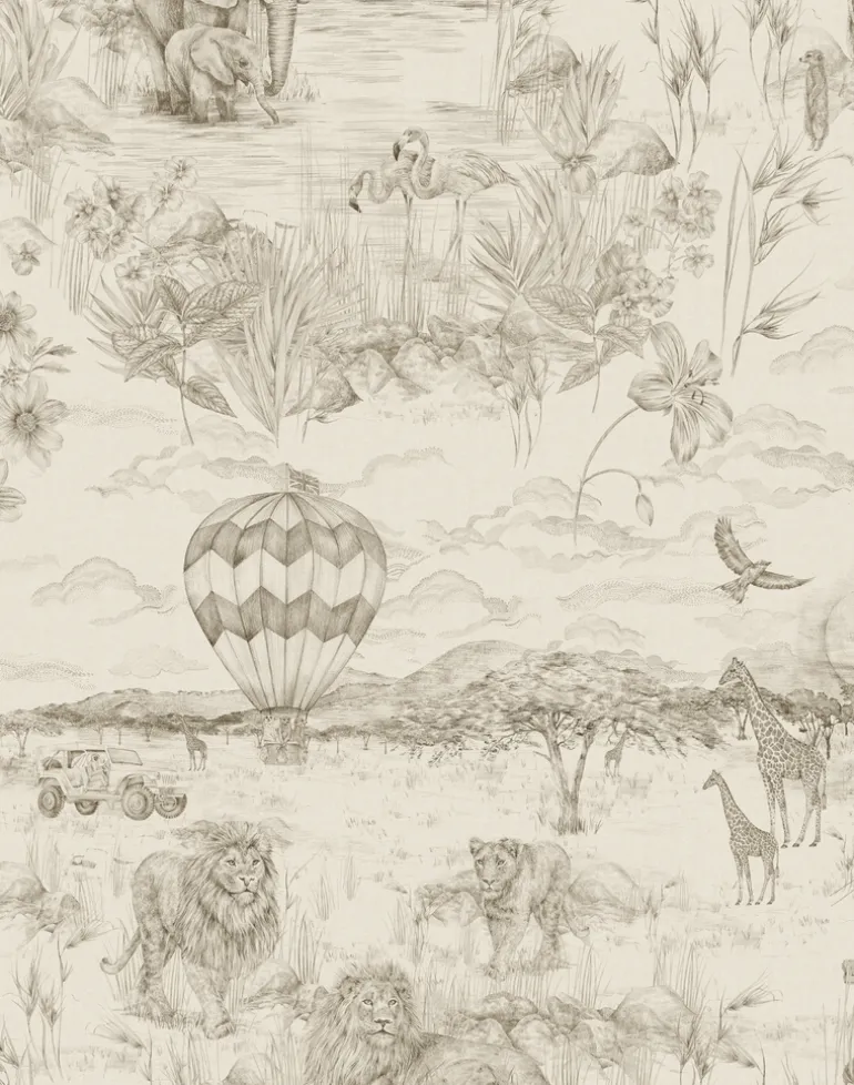 “Lyons Den” is Victoria’s take on the classic toile de Jouy wallpaper, reimagined to tell the enchanting tale of an animal-led safari. This design brings a whimsical twist to the traditional pastoral scenes typically associated with toile, replacing them with a vibrant and imaginative narrative where animals take center stage.