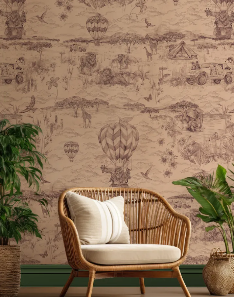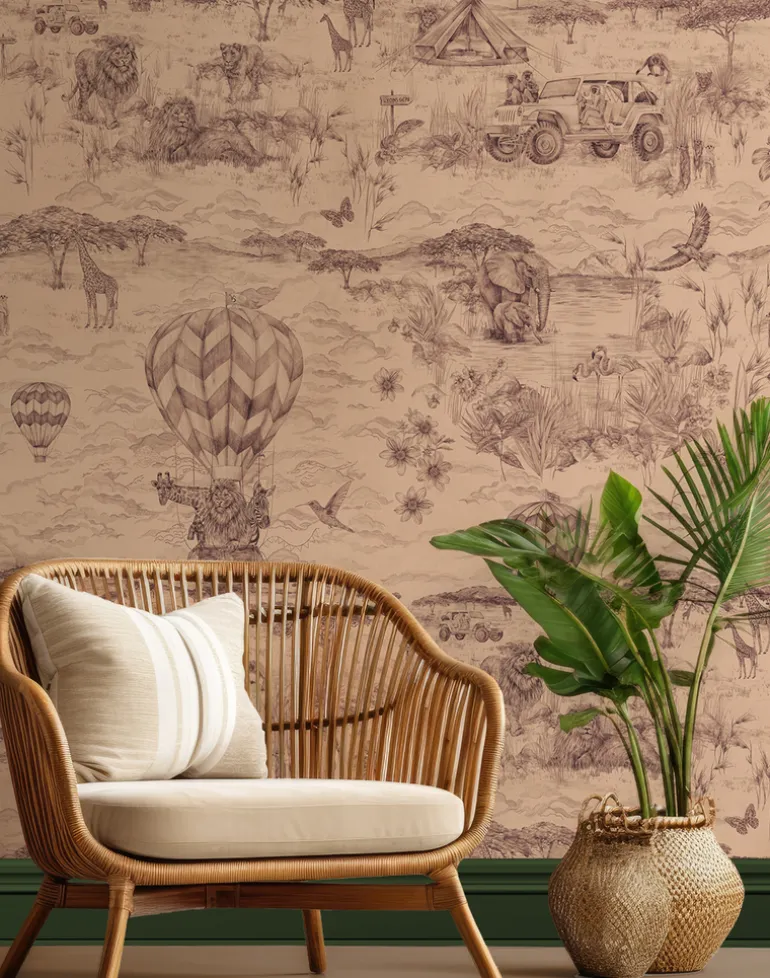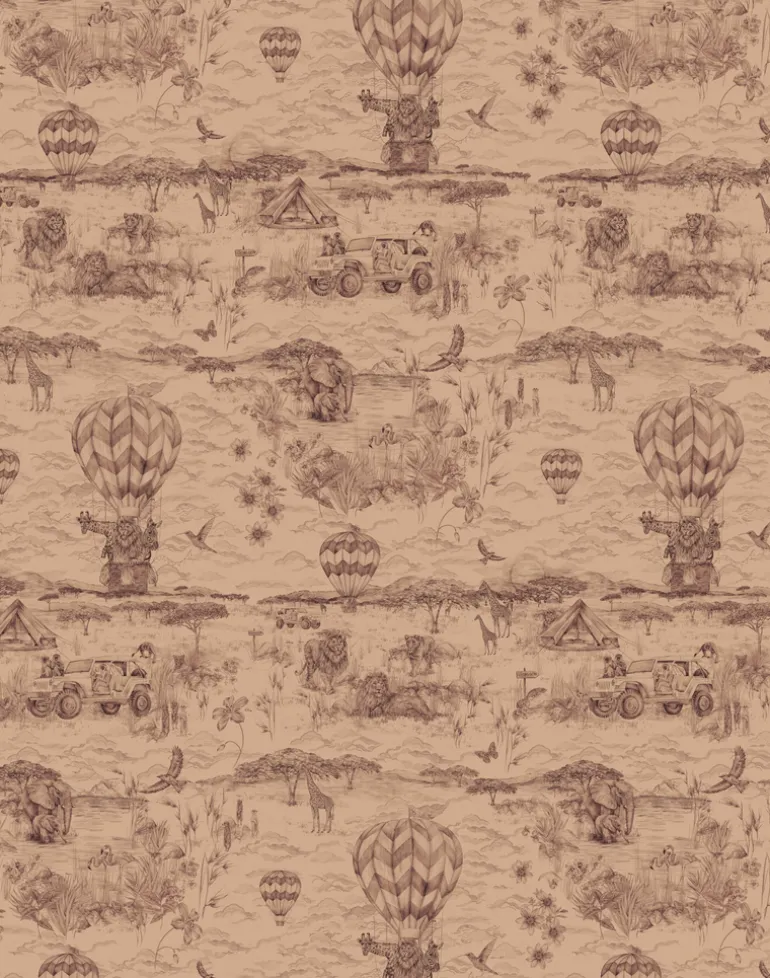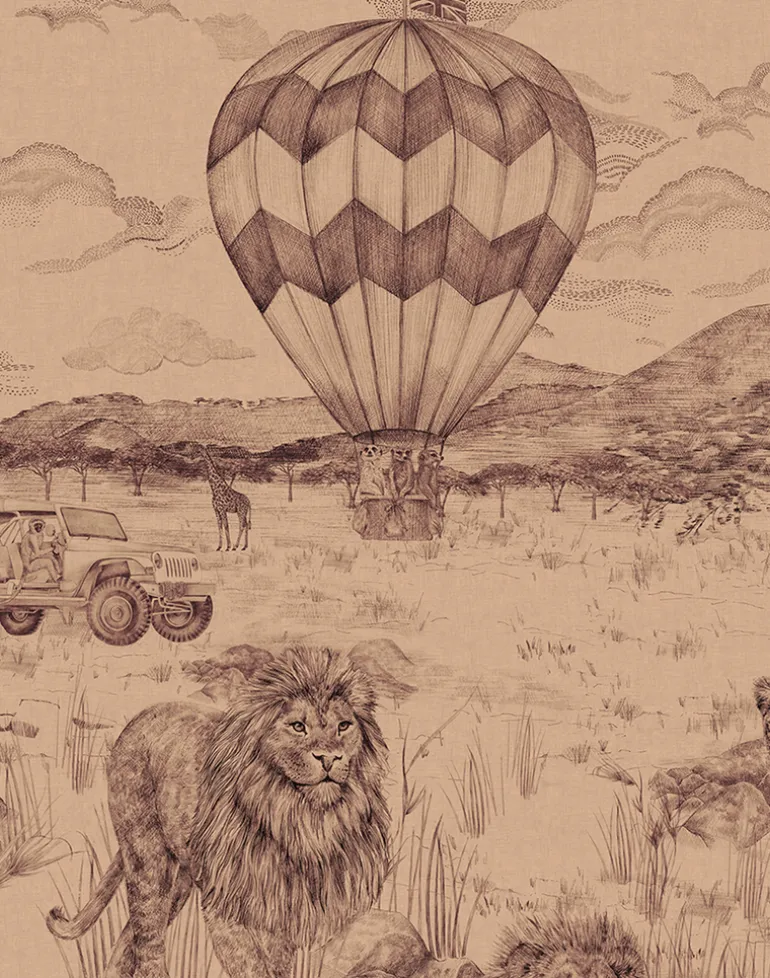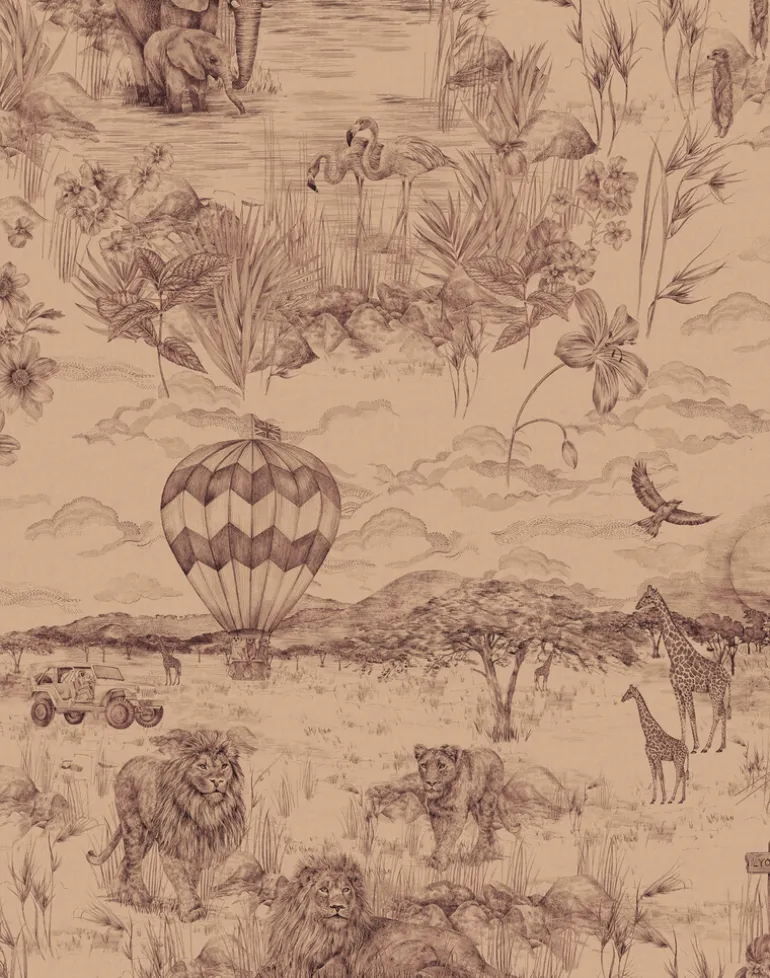 “Lyons Den” is Victoria’s take on the classic toile de Jouy wallpaper, reimagined to tell the enchanting tale of an animal-led safari. This design brings a whimsical twist to the traditional pastoral scenes typically associated with toile, replacing them with a vibrant and imaginative narrative where animals take center stage.
