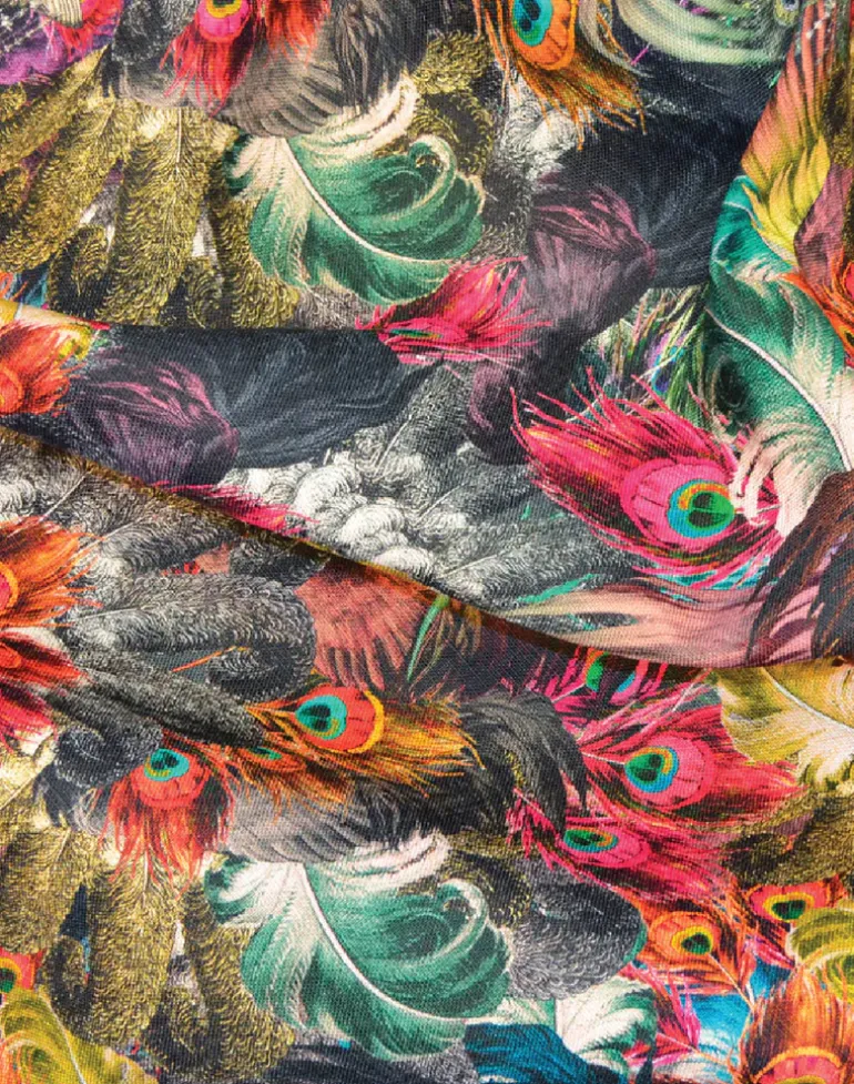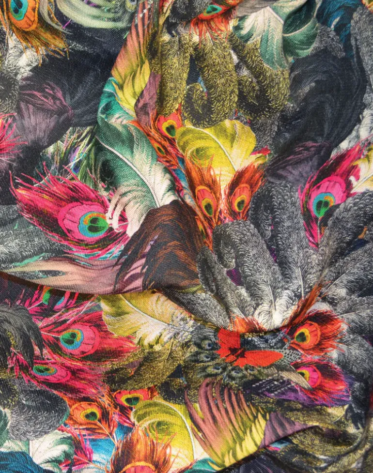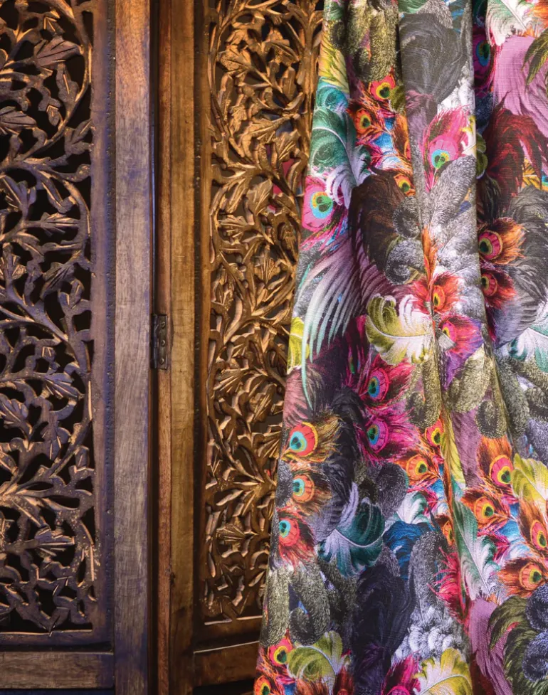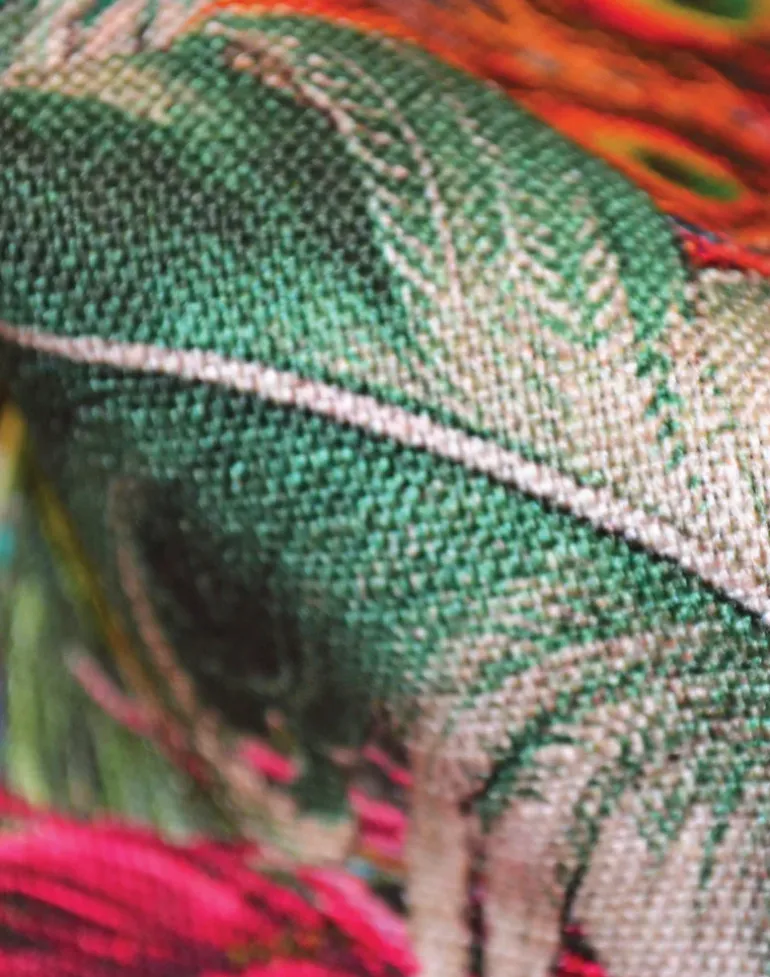 This strikingly opulent pattern sees a magnificent and colorful array of peacock feathers, ostrich plumes, and dove wings, in rich hues of precious stones: aquamarine, amber, and amethyst.