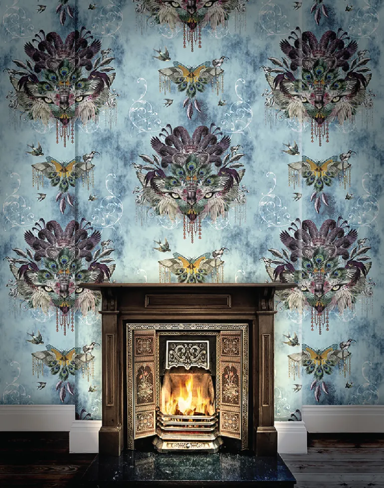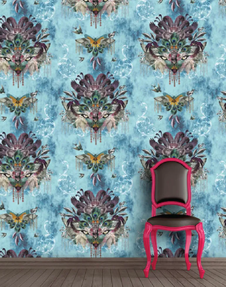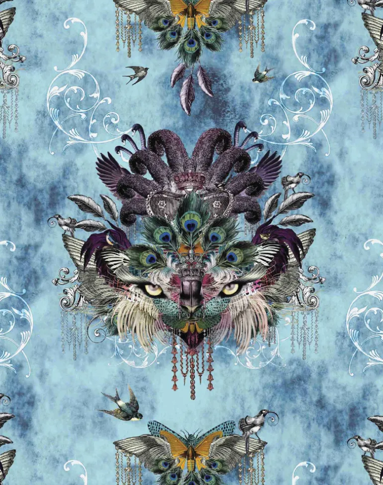 A more traditional motif pattern featuring a curiously feathered, feline majesty at a dramatic scale. The icy denim textured background sets off a striking design, guaranteed to turn heads.