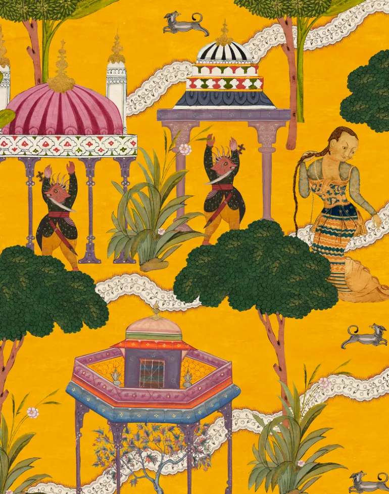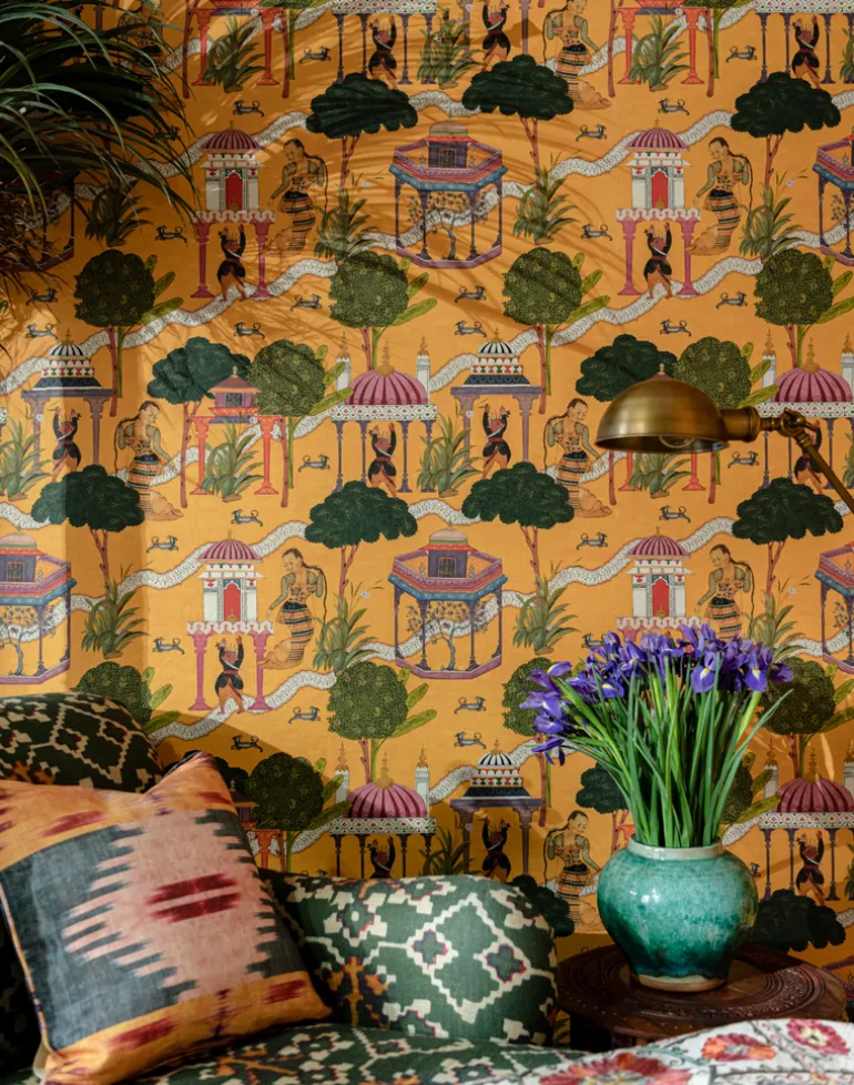 Capturing the essence of the region, the MAGHREB print features embellished architectural structures where mythical dancers perform and small trees take cover from the overhead sunlight. Bold, tiled roofs stand out amongst the sparse shrub lands as small animals frolic amongst the desert sand. Fragrant aromas of native flora fill the air with contrasting patterns creating decorative pathways across the rich, purple-toned backdrop. An energetic print which adds a folkloric charm to the home.
