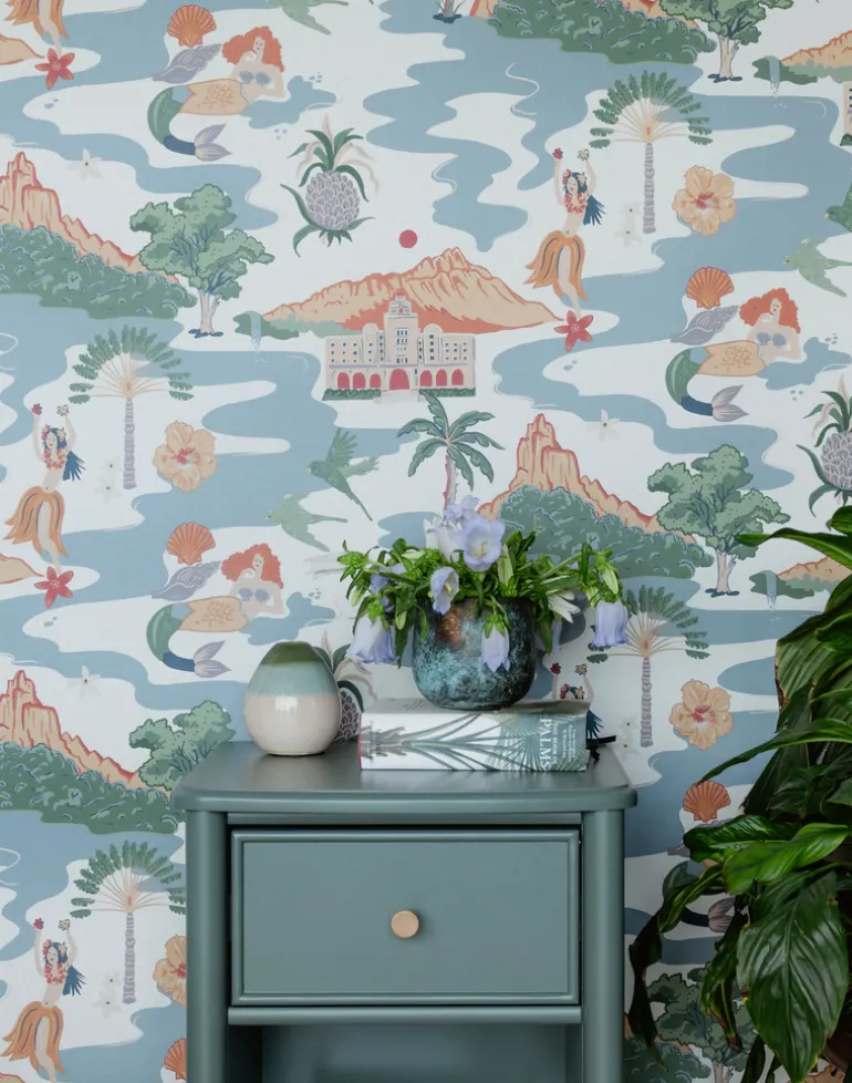 Our scenic design Mahalo meaning ‘Thank you’ in native Hawaiian. A term to show gratitude to which we have so much for this beautiful stretch of mesmerizing islands. The respect and humility the Hawaiian people show their land is so inspiring, something that seems to have been lost in western culture. Mahalo illustrates the beautiful and iconic dance of Hawaii, the Hula, The famous pink Royal Hawaiian Hotel, the lush and mountainous landscape and the widely grown ‘Dole’ Plantation Pineapple. A grass cloth texture has been added to give it a true natural Tiki bar vibe. Mahalo Hawaii! Our ‘Shell’ colorway features a natural soft off-white base with neutral hues of orange, greens and blues.