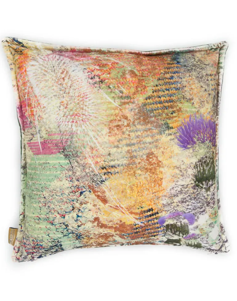 Thistle print bespoke pillows. An eclectic thistle design inspired by the Scottish landscapes, nature, rustic textures, flora and tartans. Mairi Helena prints onto the finest velvet with a complementing gold velvet back panel adding classic quality.