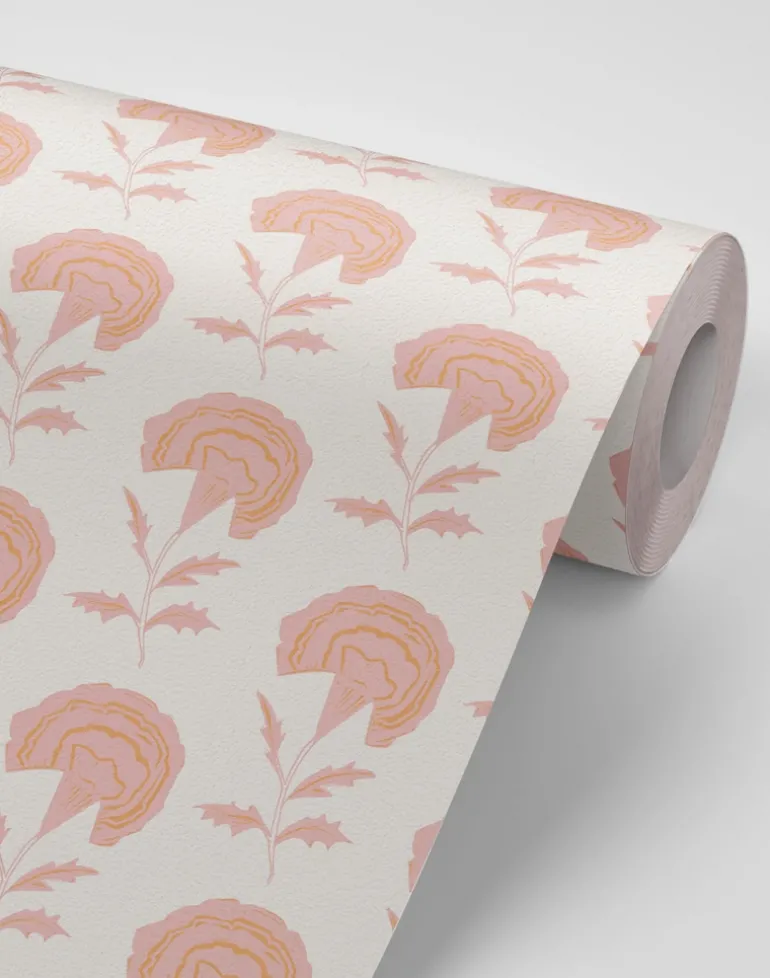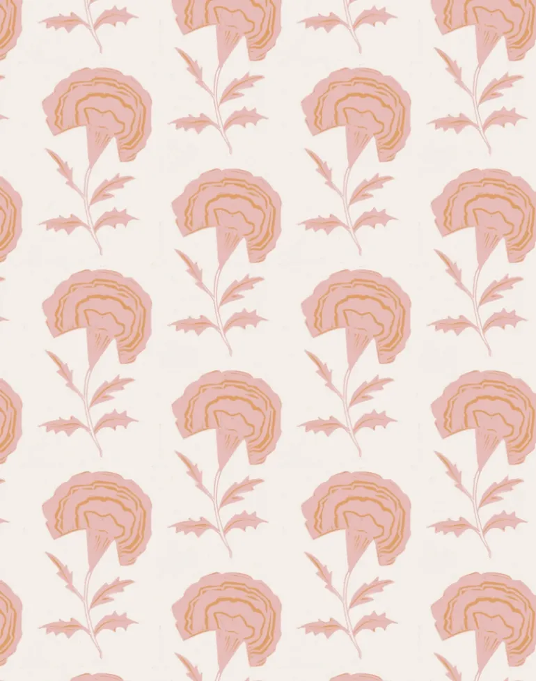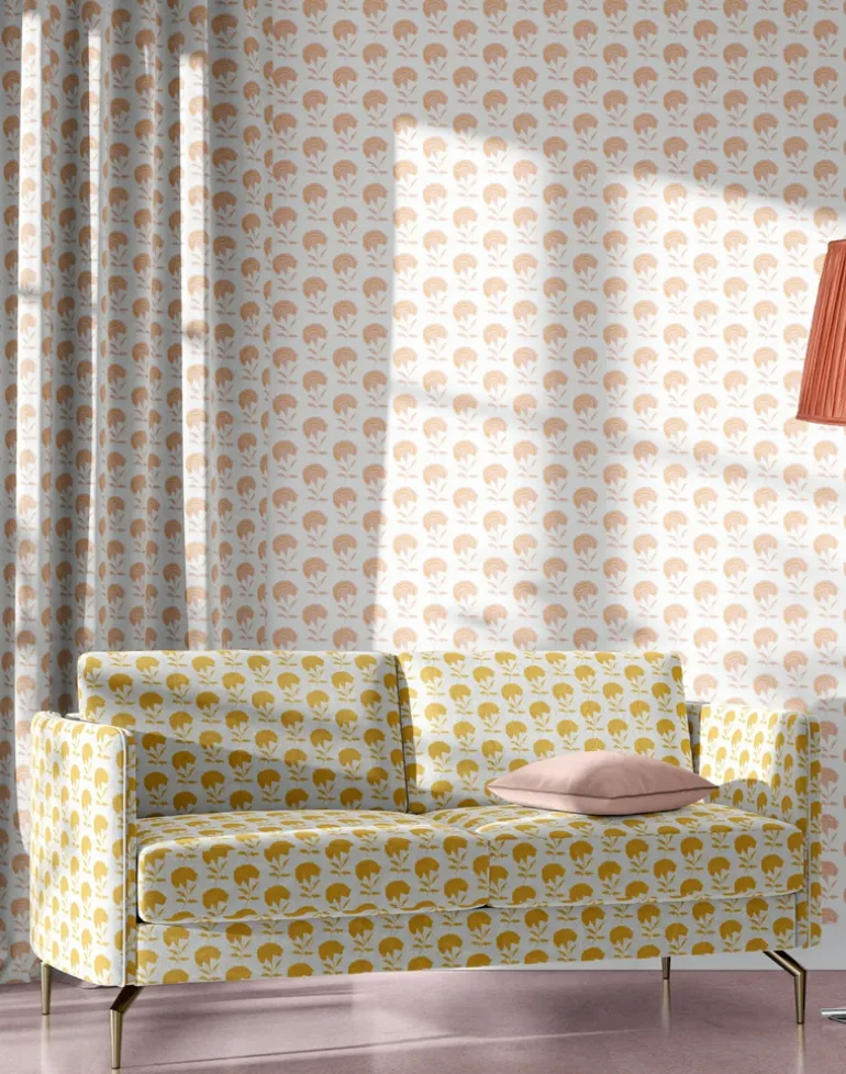 Marigolds are very popular in Hindu weddings because they represent the sun, symbolizing brightness and positive energy. They are also associated with Lord Vishnu and Goddess Lakshmi, who are considered an ideal couple in Hindu mythology, pair them together in a wallpaper and a fabric for the perfect marriage and floral home.