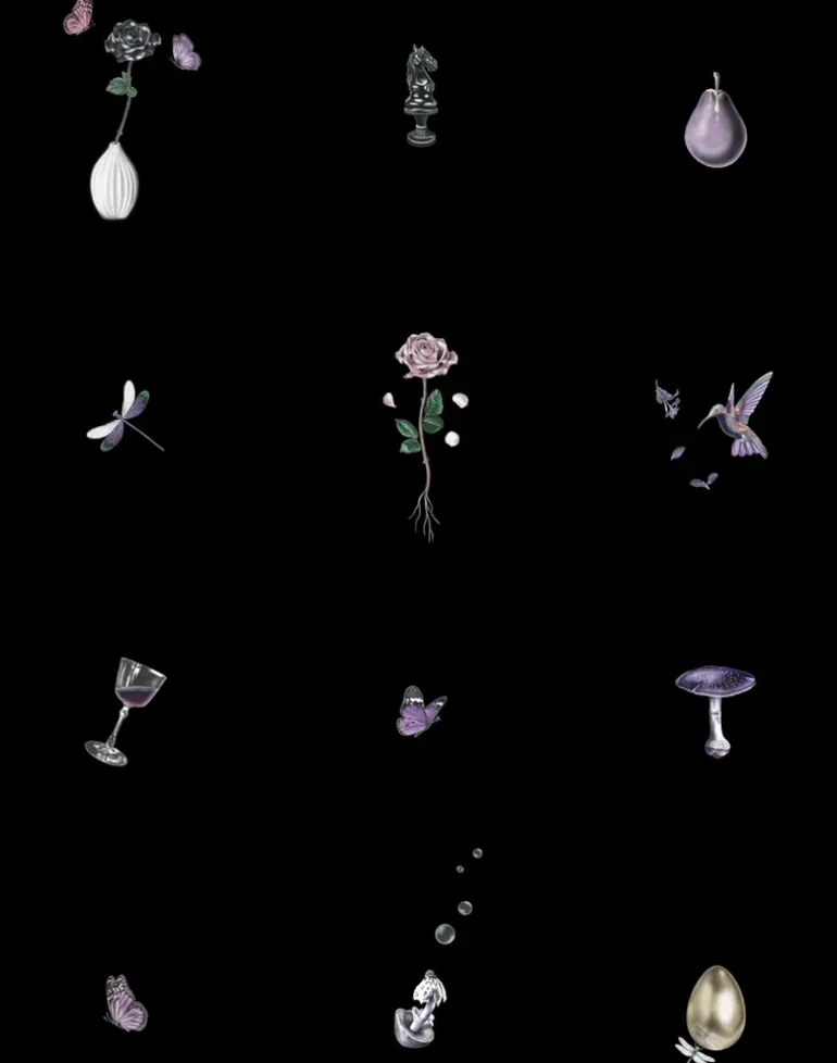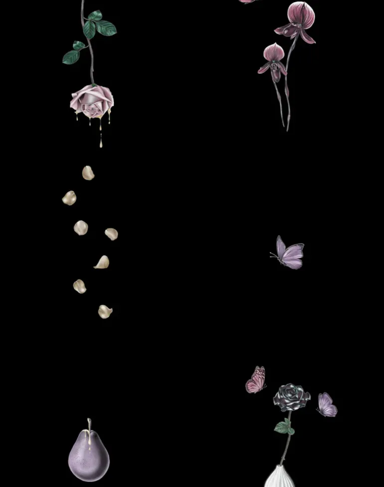 This black rose wallpaper merges dark floral elegance with artistic touches of butterflies, on a black background, creating a quirky yet refined design.
