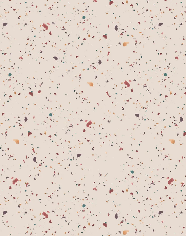 Shades of dark mauve, ochre, deep plum, and teal green on a pale fleshy peach background