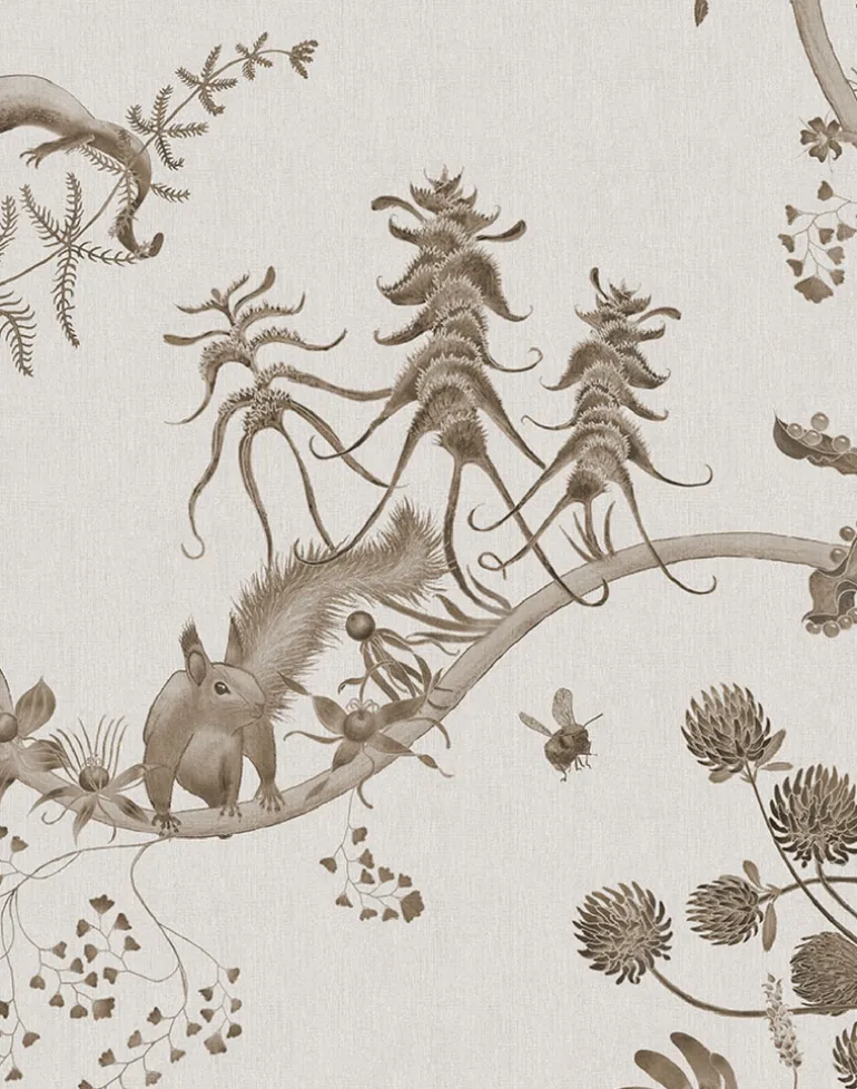 This is one of our most popular designs – a whimsical and happy design with an unusual undulating composition. This pattern is composed of English species suggested by the imaginary species in Dr. Seuss’s The Lorax. The humming fish are represented by great crested newts, the precious truffula trees are clover flowers whilst the playful barballoots are the red squirrels. The bees which also feature in a companion print are short-haired bumblebees – a wonderful conservation success story as they were extinct in the UK but acres of flower-rich meadows were planted in Kent, the bees were reintroduced and now buzz about with other rare bees benefitting from this rich habitat. Other flowers include several species of clover, Pheasant’s eye, crested cow-wheat, Stinking iris, whorled millifoil, Carthusian pinks, Herb Paris, wintergreen and blossoms of a rare old English breed of apple. Great great grandfather snail is the lagoon spire snail (thought extinct, but recently found in Chichester harbor).