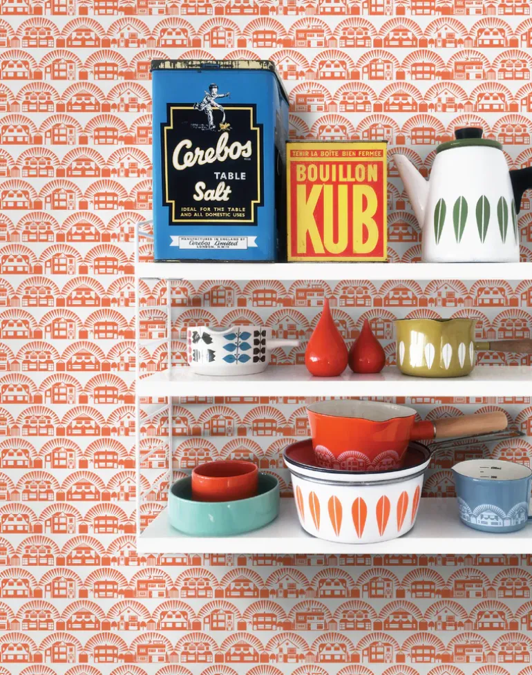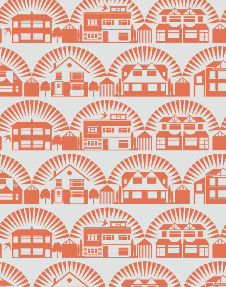 Metroland features rows and rows of 1930s houses with the sun rising on a sleepy Sunday morning. The pattern made its debut on our successful enamelware range of kitchenalia and is a cheery addition to our Saturday Night/Sunday Morning collection.