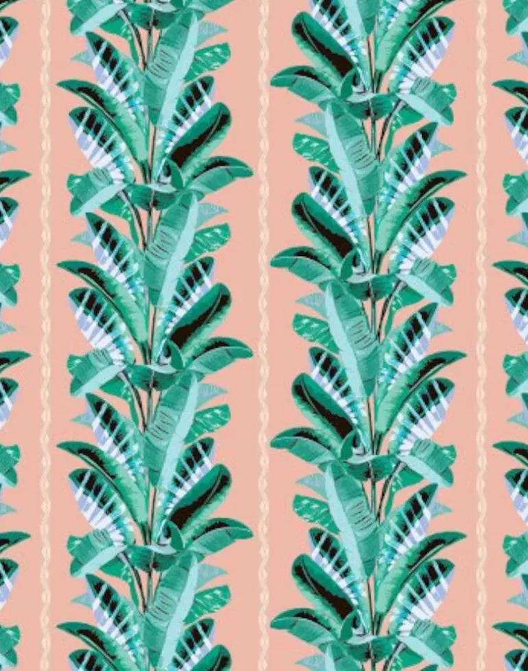 Transform your space with this bold and colorful statement wallpaper featuring color palettes inspired by the Art Deco hotels of Ocean Drive in Miami. Hand painted banana leaves with contrasting backgrounds creates a design that adds instant drama to your space. A new take on traditional botanicals that is dramatic, bold and fun!