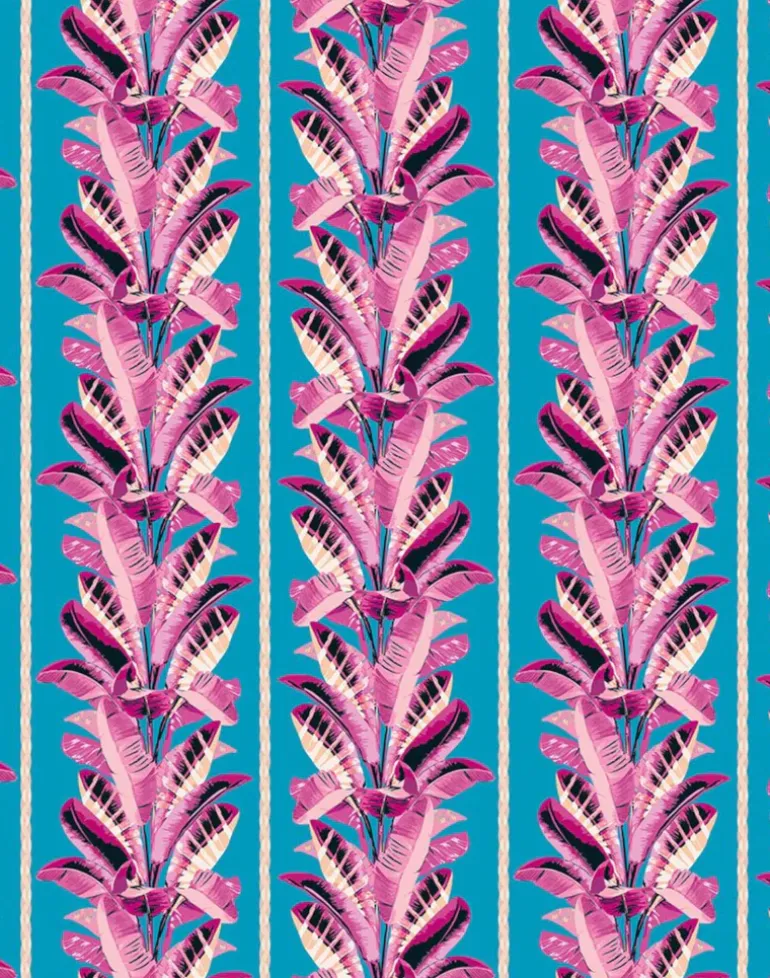 Transform your space with this bold and colorful statement wallpaper featuring color palettes inspired by the Art Deco hotels of Ocean Drive in Miami. Hand painted banana leaves with contrasting backgrounds creates a design that adds instant drama to your space. A new take on traditional botanicals that is dramatic, bold and fun!