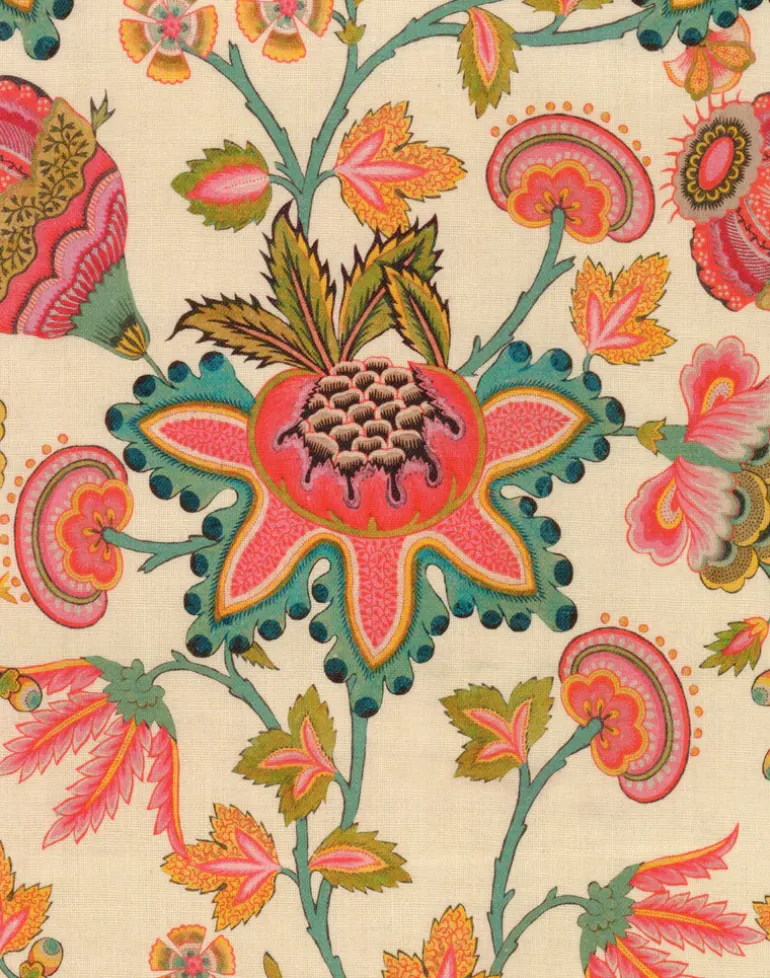 The psychedelic color palette of MIDSUMMER FLORAL merges bold pinks, pastel greens, vivid yellows, and turquoise blues in a captivating floral print set against a white background. The fine embroidered details within each leaf and petal add intrigue to the piece, nodding to the festival fashion of the 60s and the love of bold prints and color combinations.