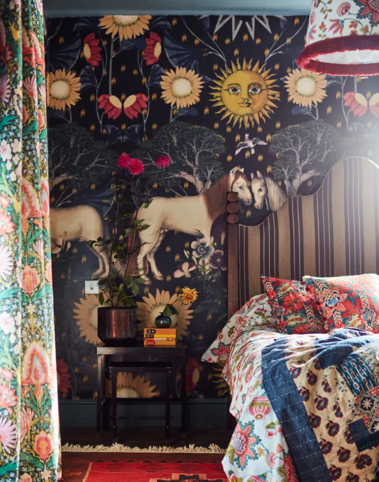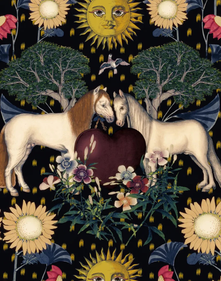 Meander through golden fields of sunflowers while wild horses graze under the shadow of woodland nearby. Symbolic hearts radiate a sense of comfort and peace as you lose yourself in the whimsical meadows which surround you with tranquility. The sun warms your skin as you listen to the sound of birds flying above you. Evoking sounds and smells of long summer afternoons, the MIRAGE wallpaper, set on two contrasting backdrops, brings a restful ambience into the room.