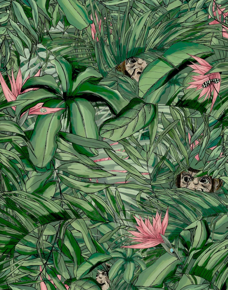Peering through the jungle foliage, the family of Monkeys are subtly camouflaged amongst the leaves, flowers and insects watching the world from their natural habitat.