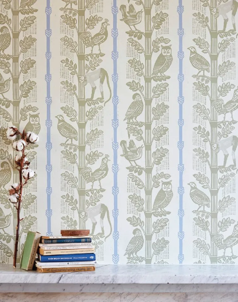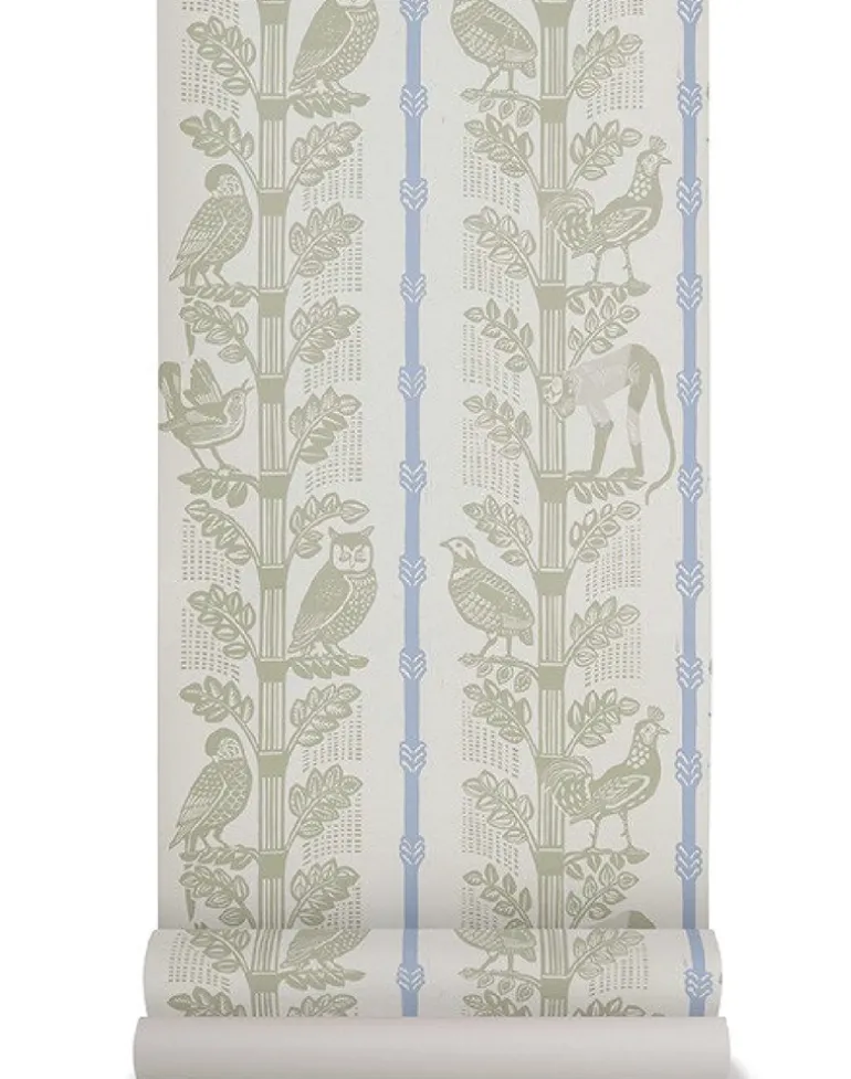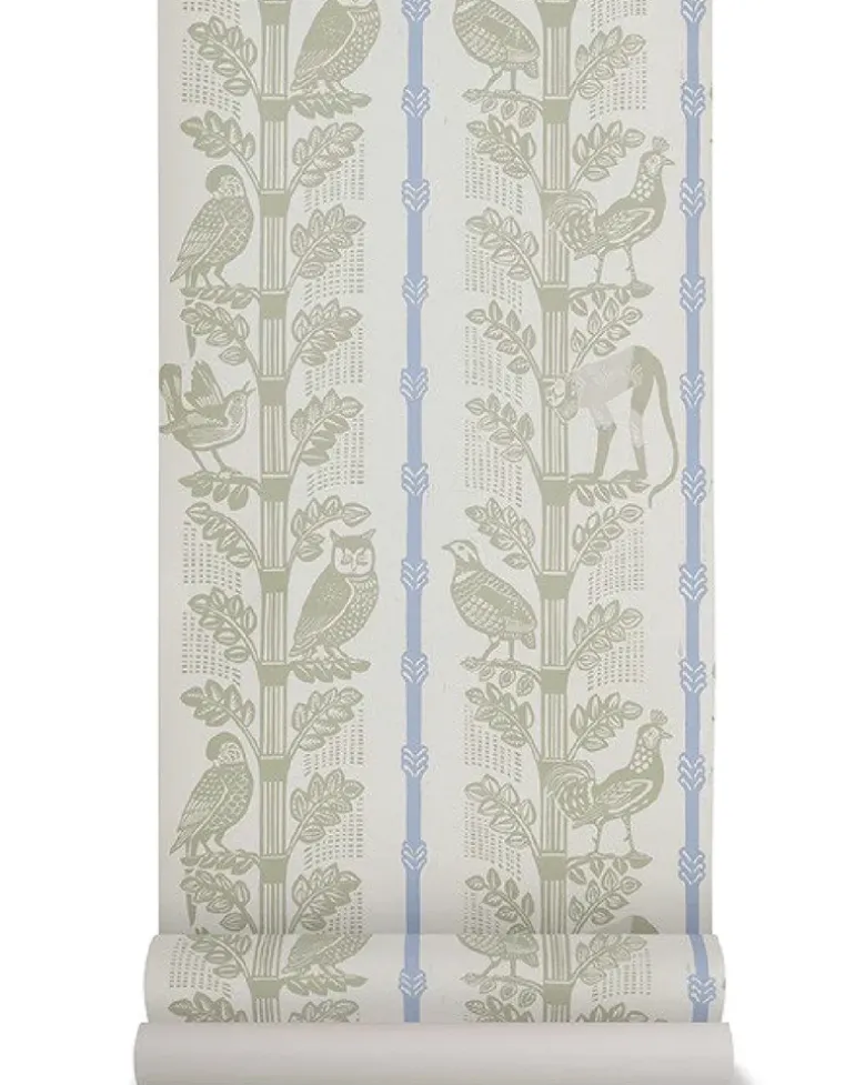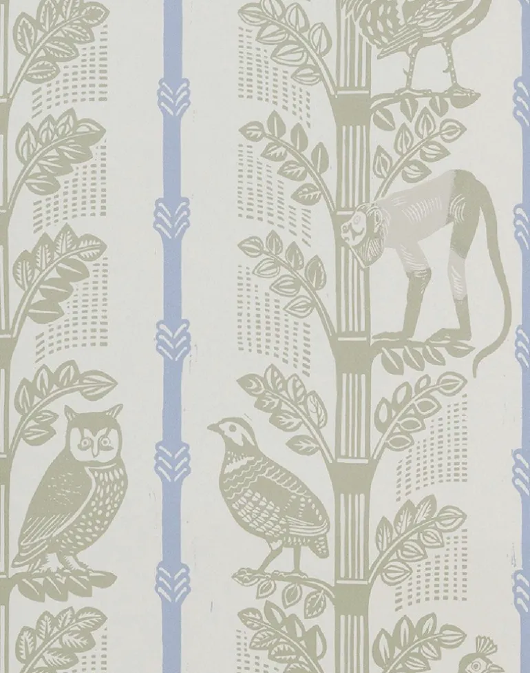 Monkeys and Birds by printmaker Sheila Robinson (1925-1988) is a 3 color wallpaper, originating from her lino-cut blocks, designed in 1958 and printed by hand to decorate the walls of Cage Cottage, the family home in Great Bardfield. This design originates from original lino-cut elements by Sheila Robinson and as with many St. Jude’s designs the texture of these hand printed elements may well be reflected in this wallpaper.