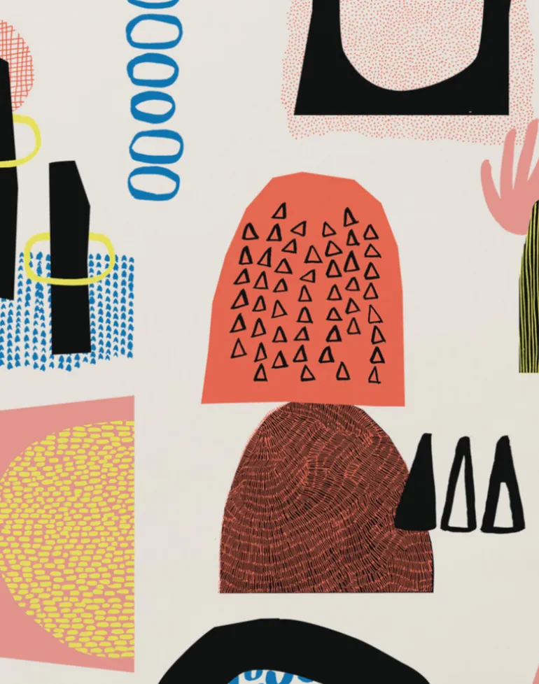 This five-color wallpaper is hand-screenprinted using water-based inks on recyclable paper. This paper is also available in four additional colorways.