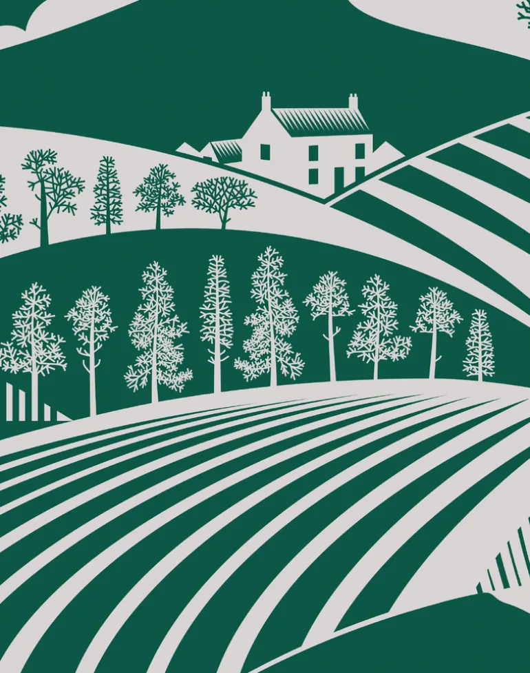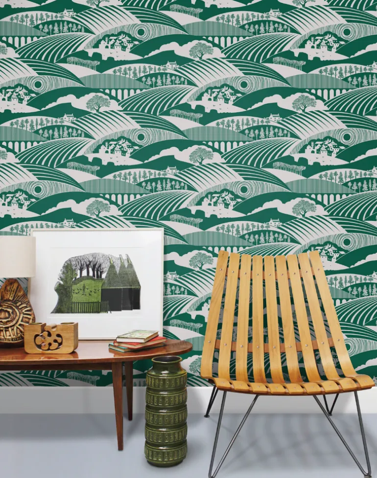 Moordale (the distance between us) wallpaper is the latest release from our Saturday Night/Sunday Morning collection – and features the North Yorkshire Moors and Yorkshire Dales, where Mark and Keith of Mini Moderns spent their teenage years. Icons of the area included in the sweeping landscape print are Roseberry Topping and the Cow and Calf at Ilkley.