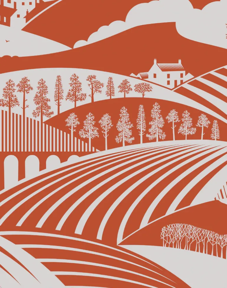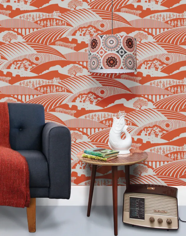 Moordale (the distance between us) wallpaper is the latest release from our Saturday Night/Sunday Morning collection – and features the North Yorkshire Moors and Yorkshire Dales, where Mark and Keith of Mini Moderns spent their teenage years. Icons of the area included in the sweeping landscape print are Roseberry Topping and the Cow and Calf at Ilkley.