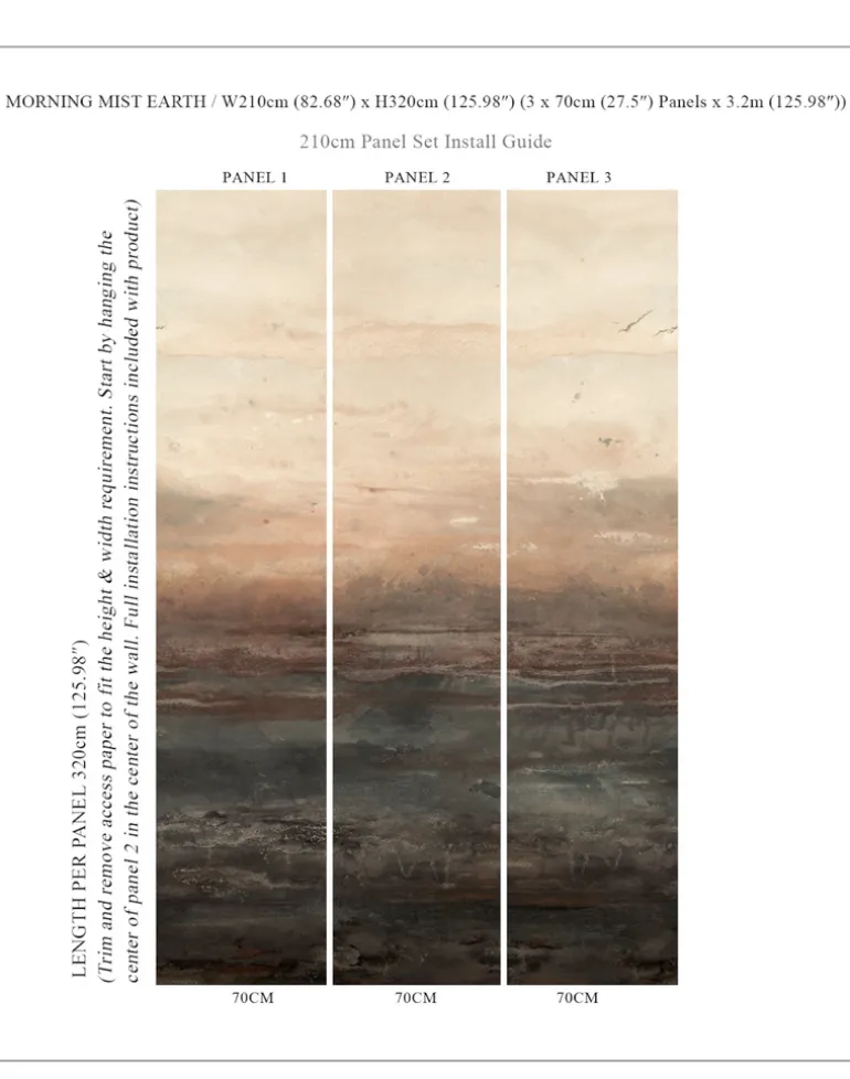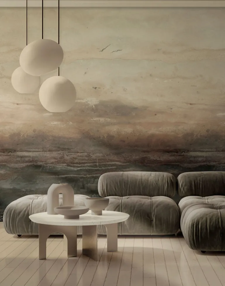An original plein-air painting has been masterfully translated onto a high-quality non-woven wallpaper, enhancing every nuance of the artist’s brushstroke. Set across four highly usable colorways. Earth, Brown, Black, and Ocean.