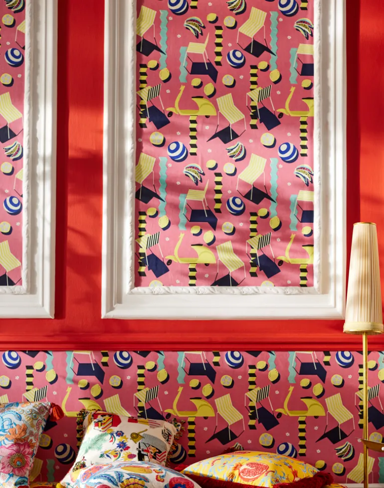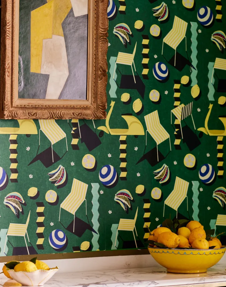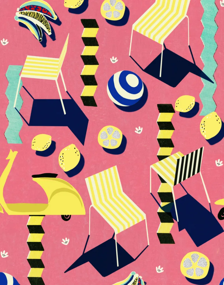 Transform your space into a summer oasis with MOTO BELLO, letting its vibrant hues and playful motifs evoke memories of lazy days spent under the sun. This exuberant tapestry of design captures the essence of leisure and delight, where beach chairs beckon invitingly, lemons add a zesty pop of color, and the iconic Vespa guaranties a touch off retro chic. Abstract elements dance across the surface, infusing the design with a sense of movement and dynamism that is both captivating and exhilarating. Available in both verdant green and playful pink backgrounds, MOTO BELLO offers a choice between lush tranquility and energetic whimsy, allowing you to tailor your space and unravel your playful spirit.