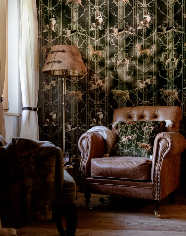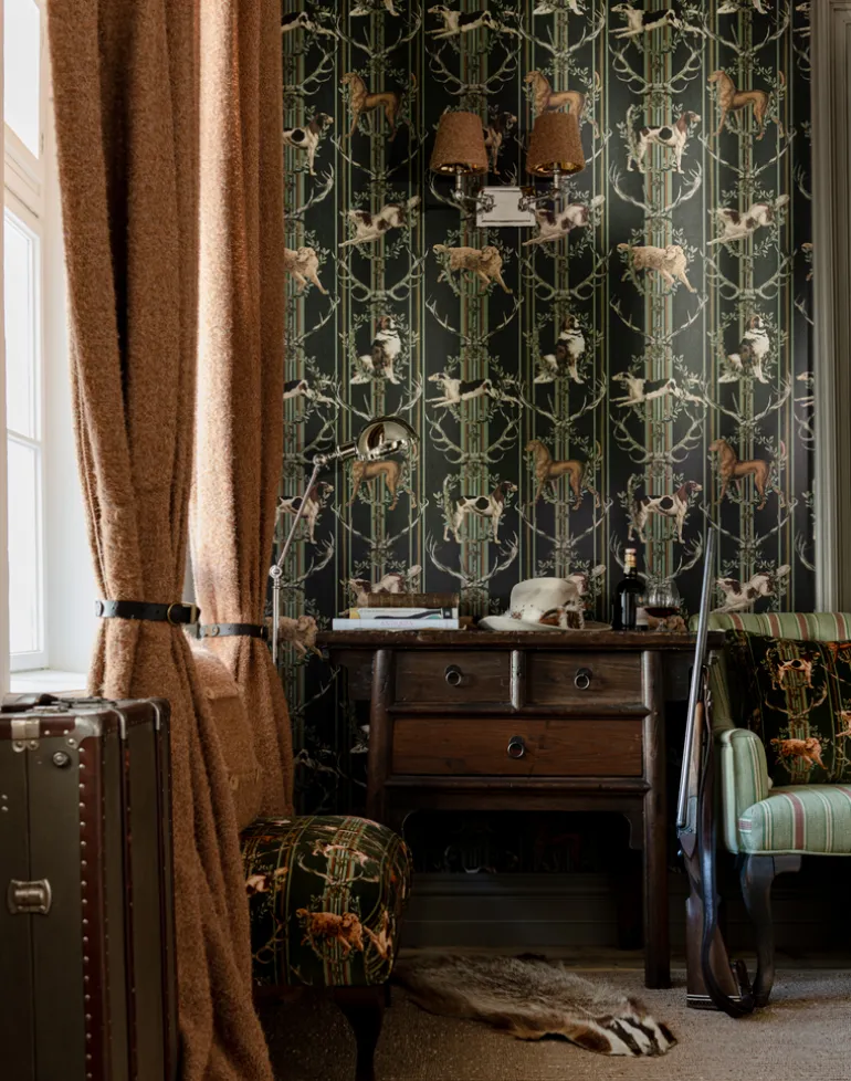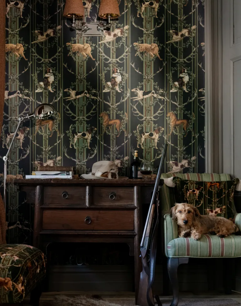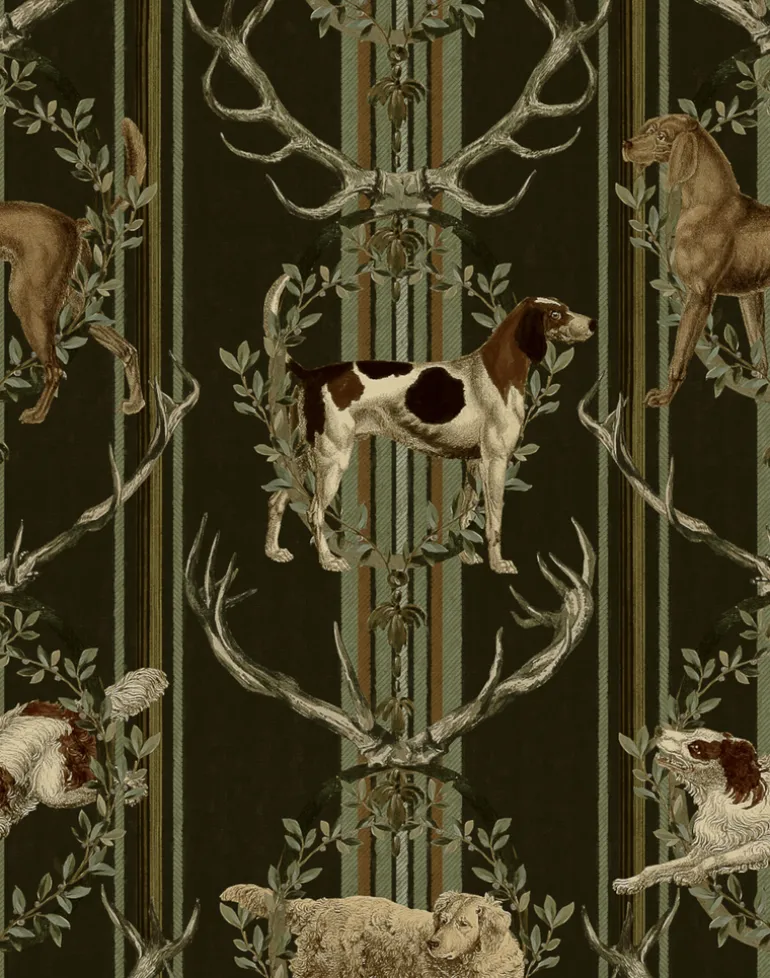 Loyal, agile and intelligent, there is a reason why alpine dogs are so famous among worldwide breeds. This playful pattern celebrates the spirit of those faithful companions with a pair of noble hounds leaping across a striped background. Leafy garlands, majestic antlers and a smart stripe come together to complete the handsome MOUNTAIN DOGS design.