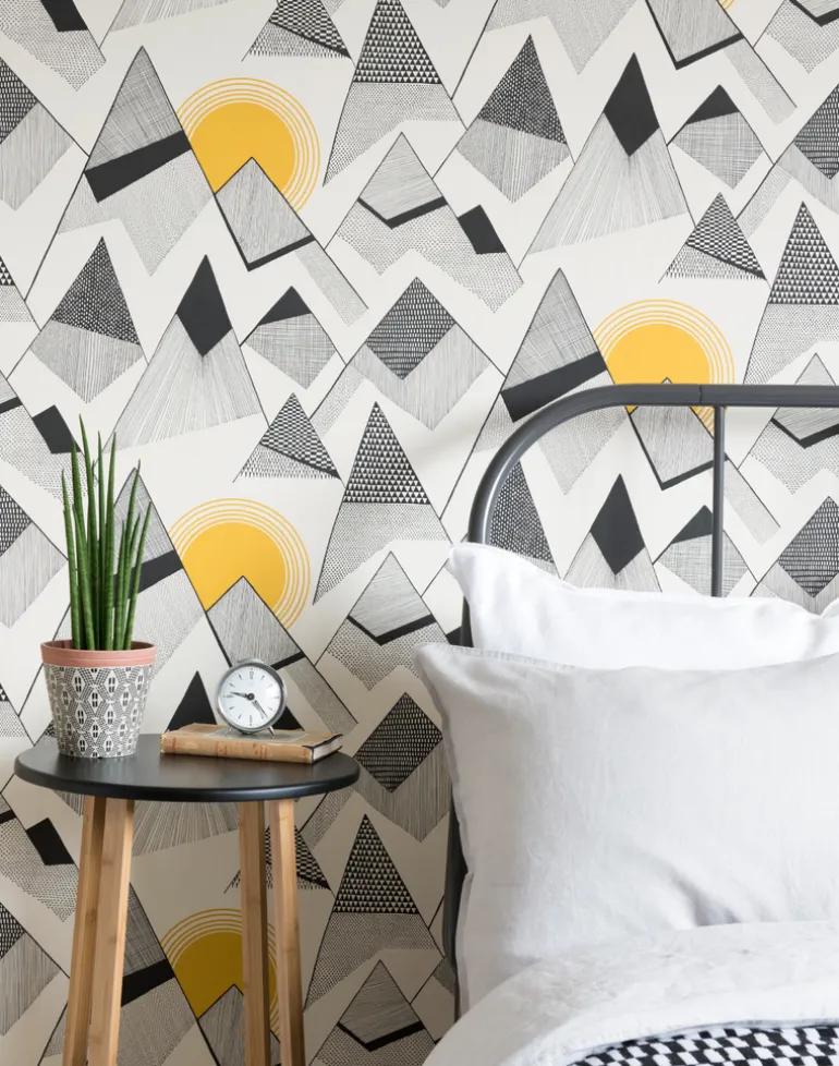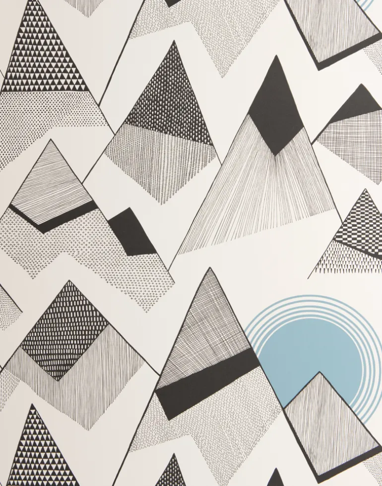 Inspired by the scenic peaks and fells of Great Britain, Mountains evolved from simple sketches of rugged backdrops and textures used in mapmaking. Between the illustrative outlines, bold suns (or moons) catch the mountain edges as they rise and set. All of our prints were originally drawn by hand and developed in our own studio.