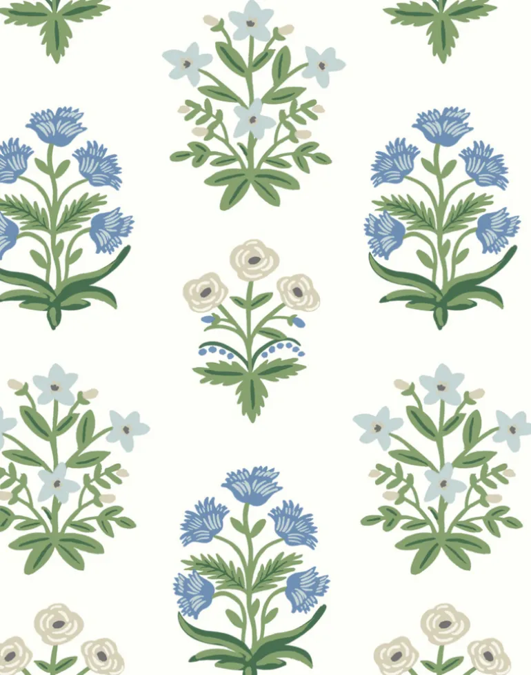 Delicate bouquets of block-print-inspired flowers are neatly arranged in a grid, for a print that is both organized and organic. This wallpaper is screen printed and comes in 27 inch rolls with a 25.25 inch repeat.