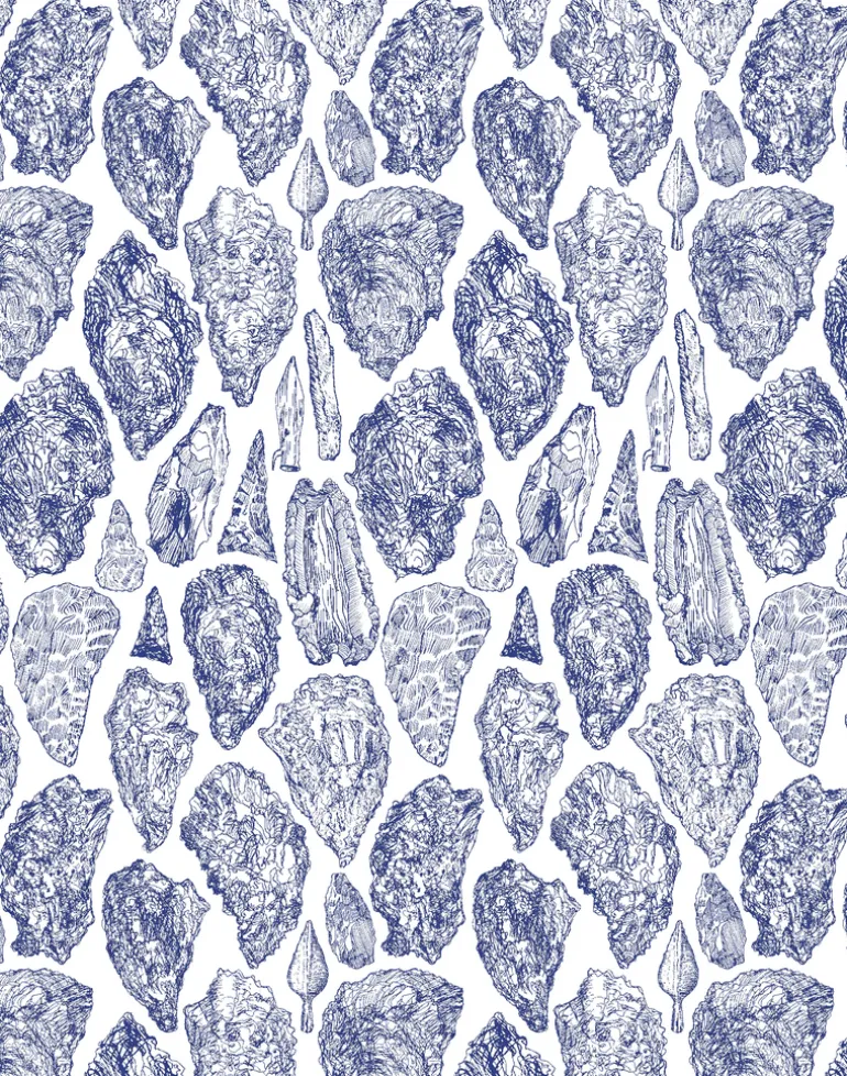 Native Tools was created from drawings of photographed artifacts found in NYC. Merenda sourced many images from the Native American Museum in lower Manhattan. This pattern pays homage to the Lenape people, whose land NYC was built on, and it reminds us that we are on stolen land and to respect the land we share.