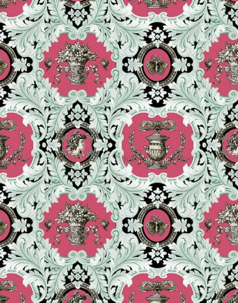 Elevate your space with Neo Renaissance vintage style wallpaper. This bold design features scrolls and golden heads are reimagined in a vibrant, contemporary color palette. This luxury maximalist wallpaper will transform your space instantly and add a touch of decadence to your walls. Available in six bold color ways.