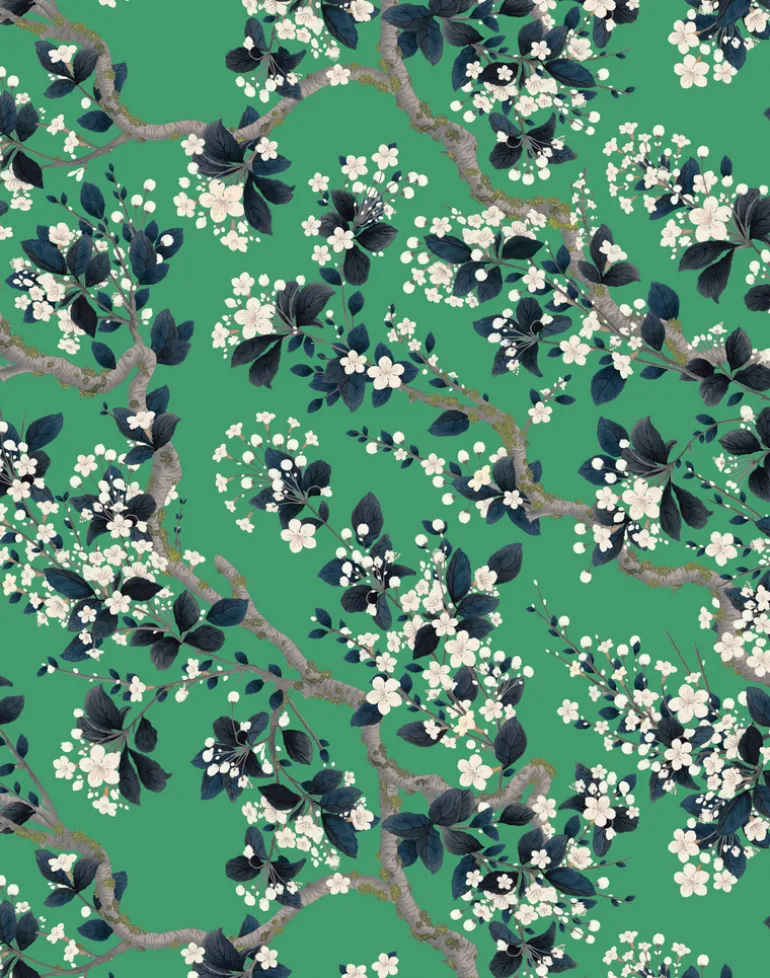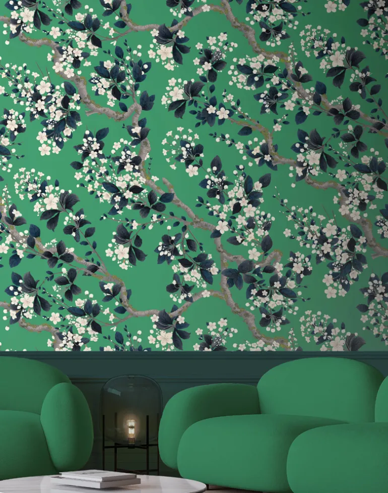 Nimbus brings into view a scene as if lying beneath a Sakura tree, depicting flowers, leaves and branches bursting forth into life. The effect is one of a tree, growing diagonally across a room, bringing with it a magnificent organic geometry evoking the optimism of spring. Printed as a super wide design onto a non-woven paper, each element is perfectly hand painted to harmonize both raw and twisting branches, each adorned with a ‘galaxy’ of newly opened blossoms. Nimbus is the perfect evocation of modern-day glamour with a material quality to match.