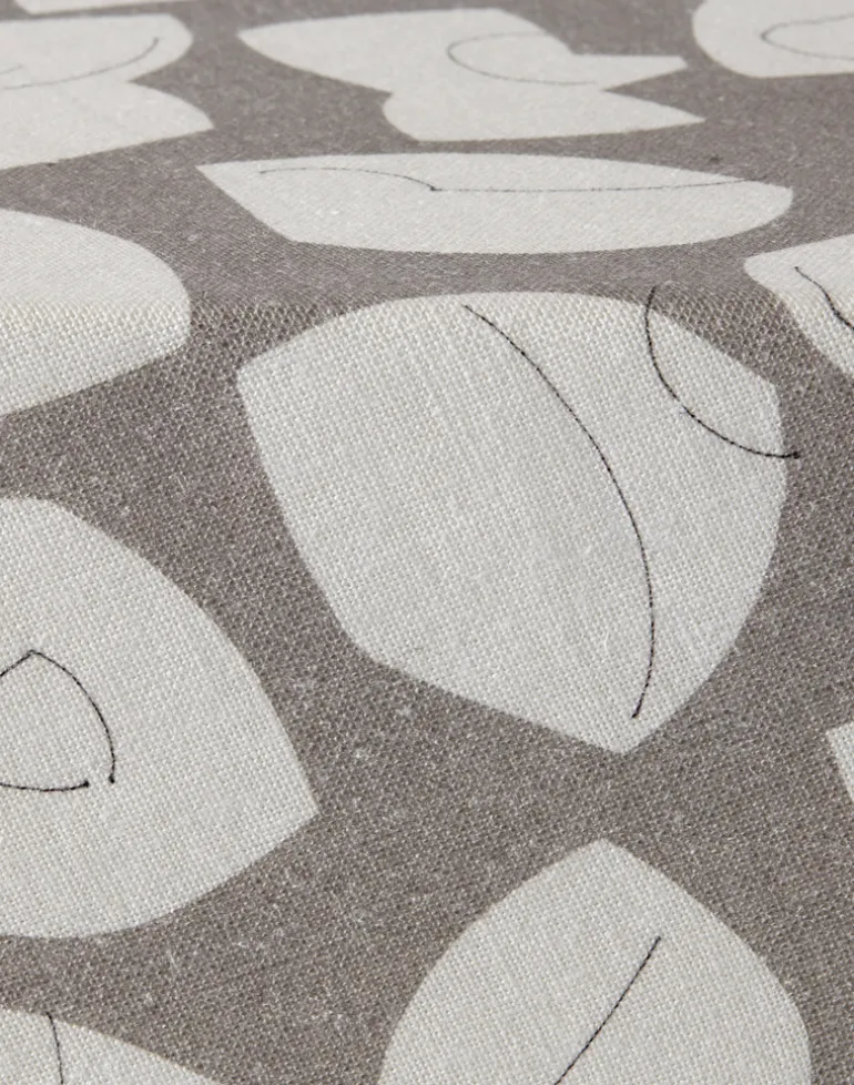 Printed with reactive dyes onto a textured heavyweight linen which softens with use. This print has a complementary off white silhouette and off black line detail. Because of the nature of the linen, the solid background color has a slightly textured appearance.