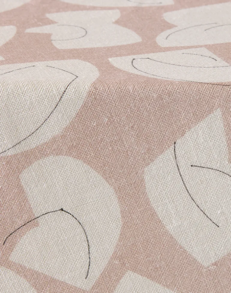Printed with reactive dyes onto a textured heavyweight linen which softens with use. This print has a complementary off white silhouette and off black line detail. Because of the nature of the linen, the solid background color has a slightly textured appearance.